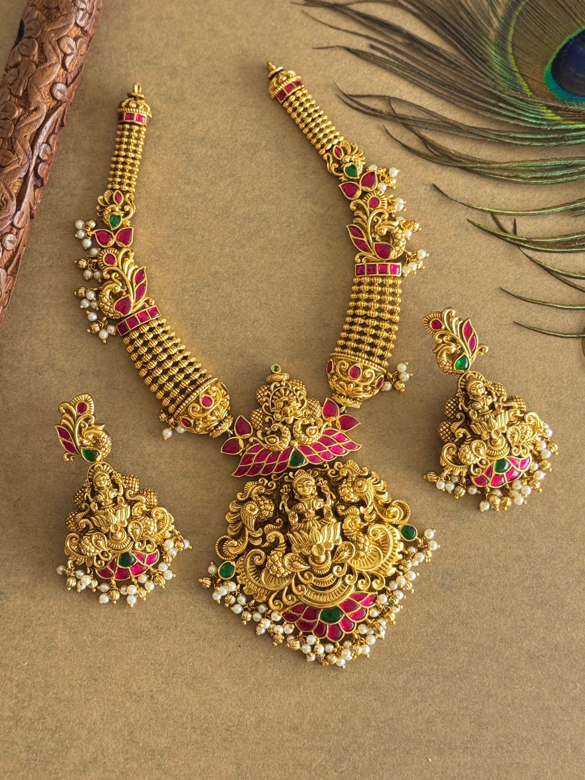 Gold tone pink-green kundan jadau pearl cluster Lakshmi-peacock necklace set dj-51550