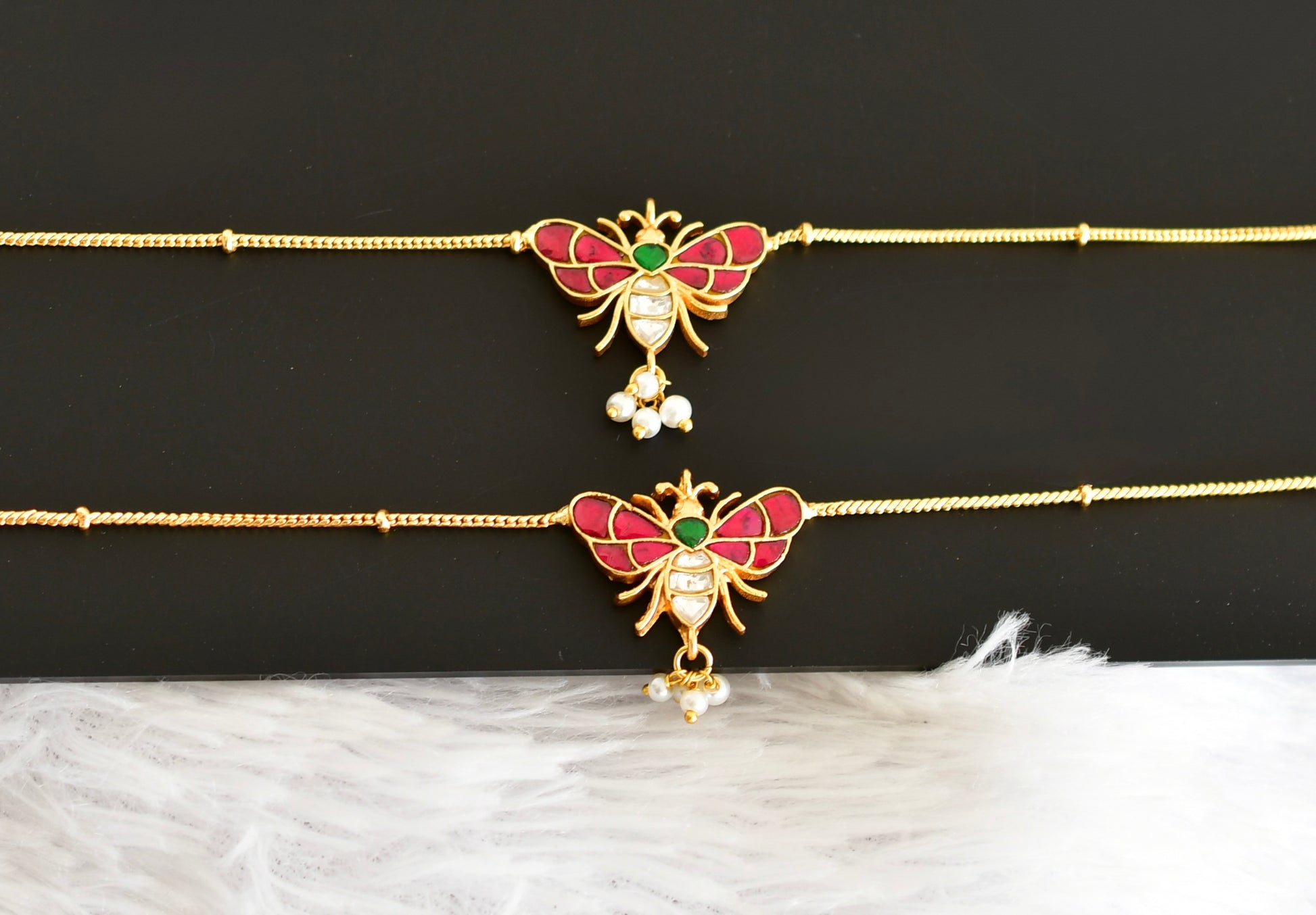 Gold tone pink-green pearl butterfly kundan jadau anklets dj-52387