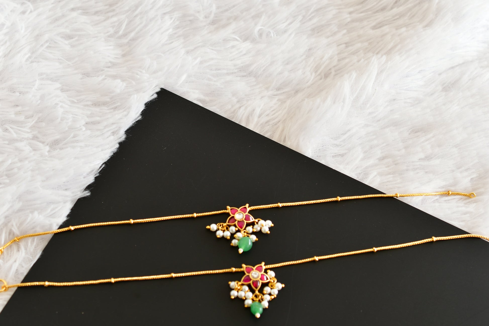 Gold tone pink-green-white flower kundan jadau anklets dj-52392