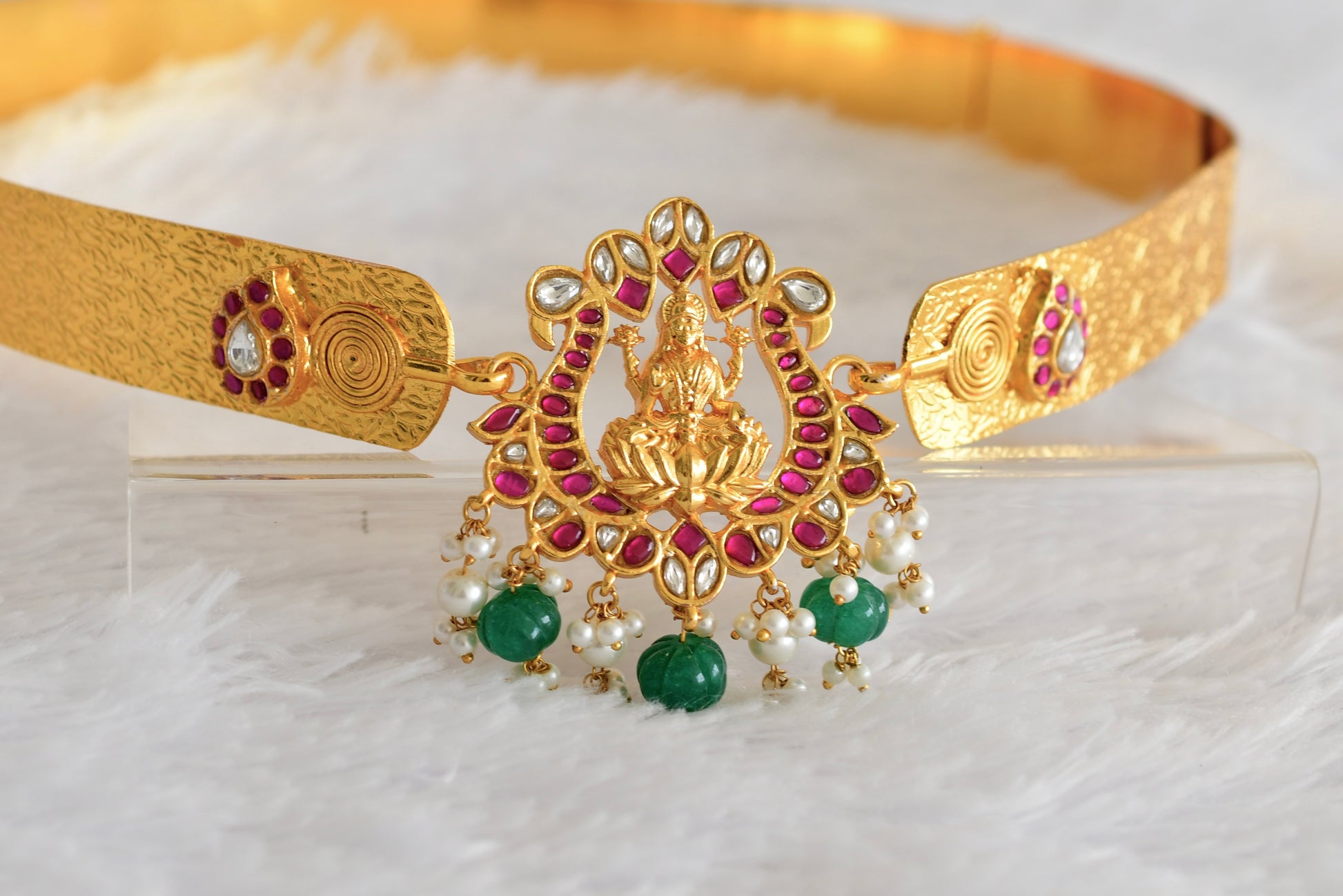 Gold tone pink-green-white kundan jadau Lakshmi mango waist band dj-52175