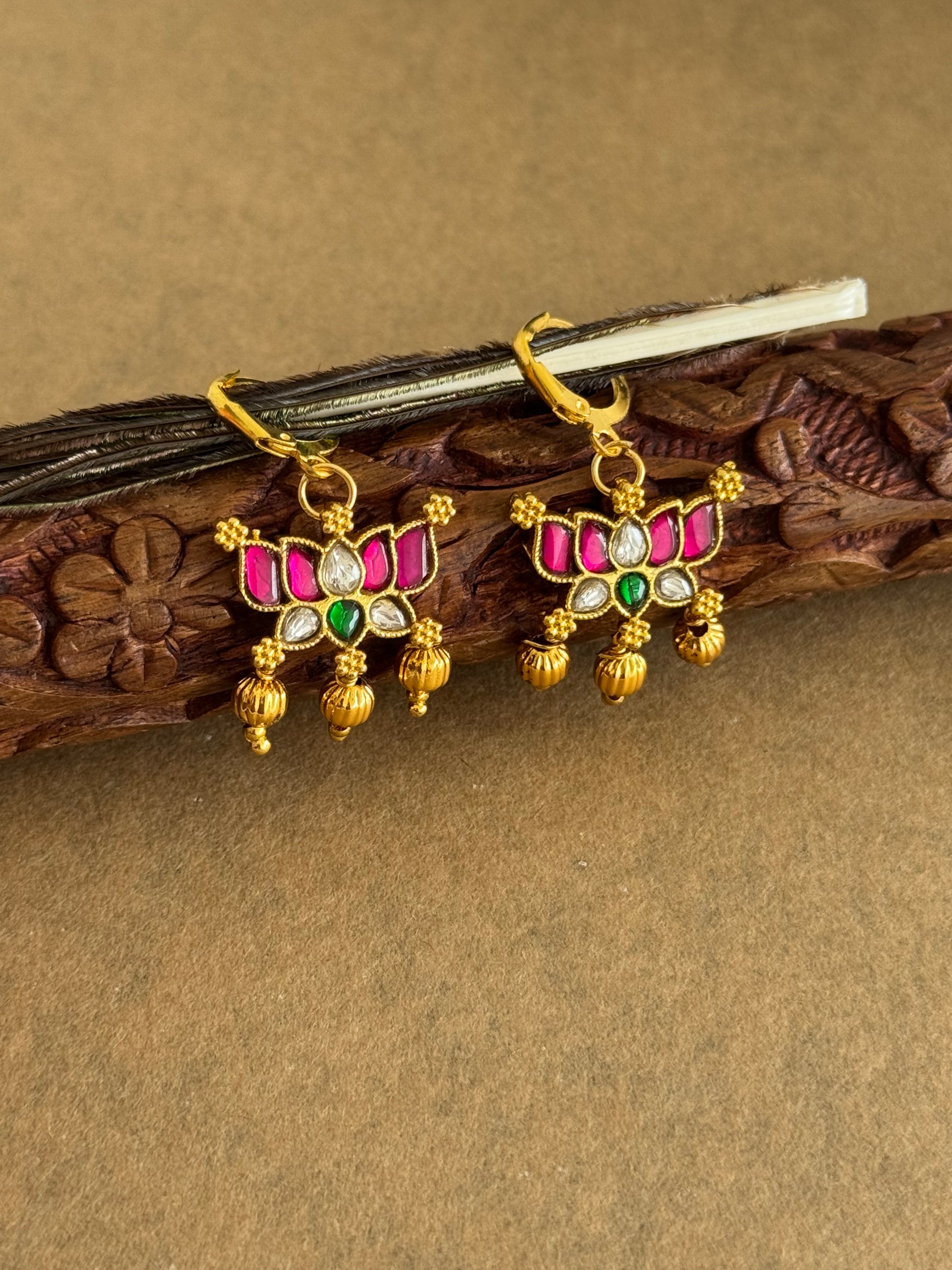 Gold tone pink-green-white kundan jadau lotus hook earrings dj-51530