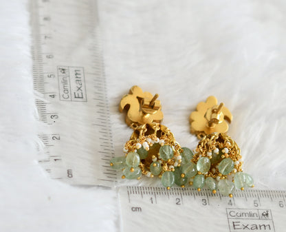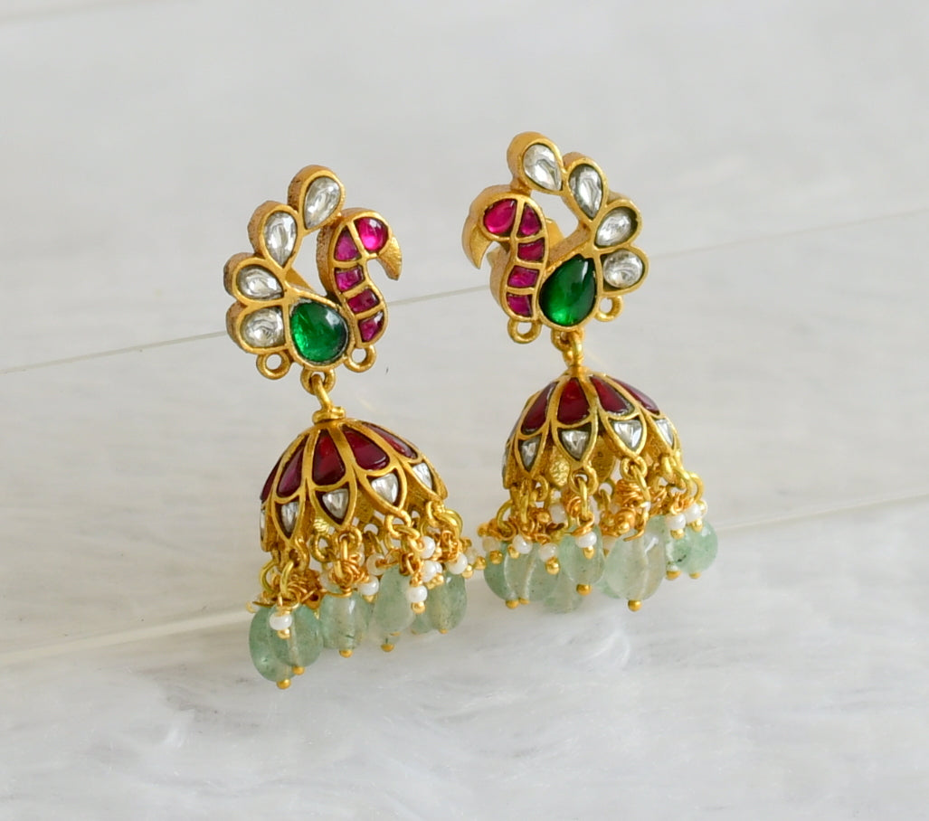 Gold tone pink-green-white kundan jadau sea green bead peacock jhumkka dj-50646
