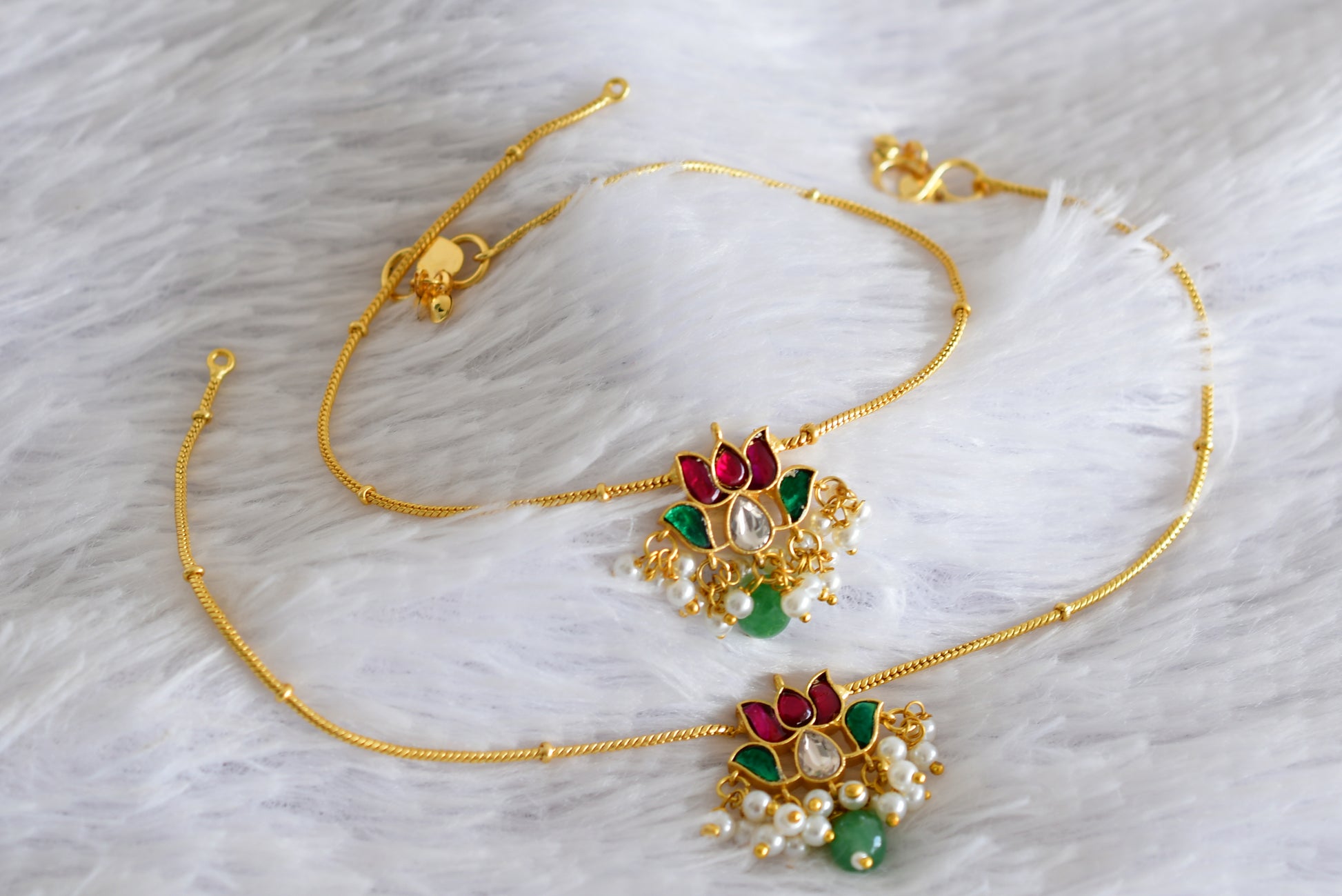 Gold tone pink-green-white lotus kundan jadau anklets dj-52398