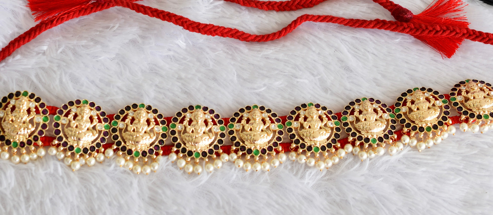Gold tone precious kemp-green-white pearl lakshmi waist band dj-52270