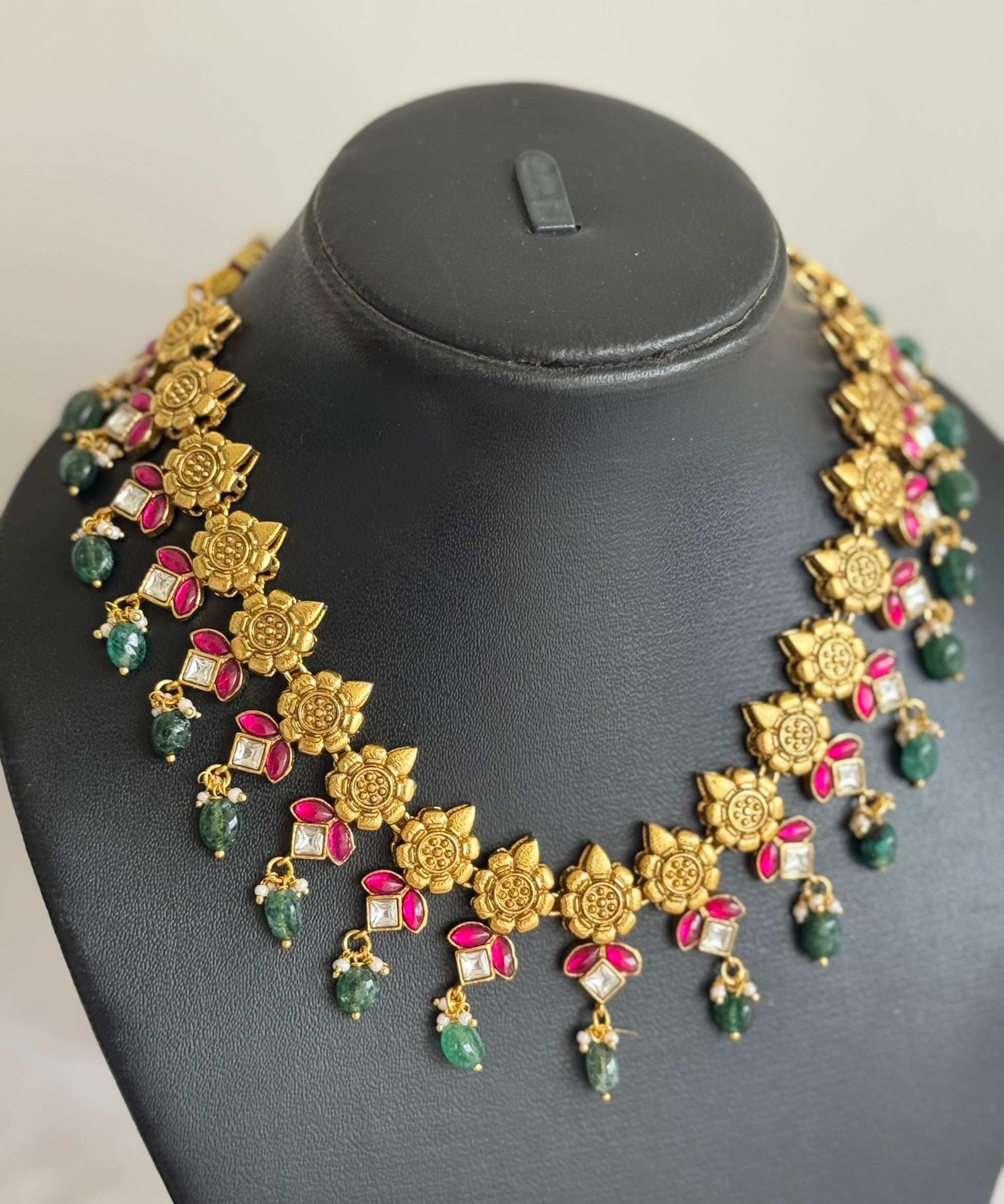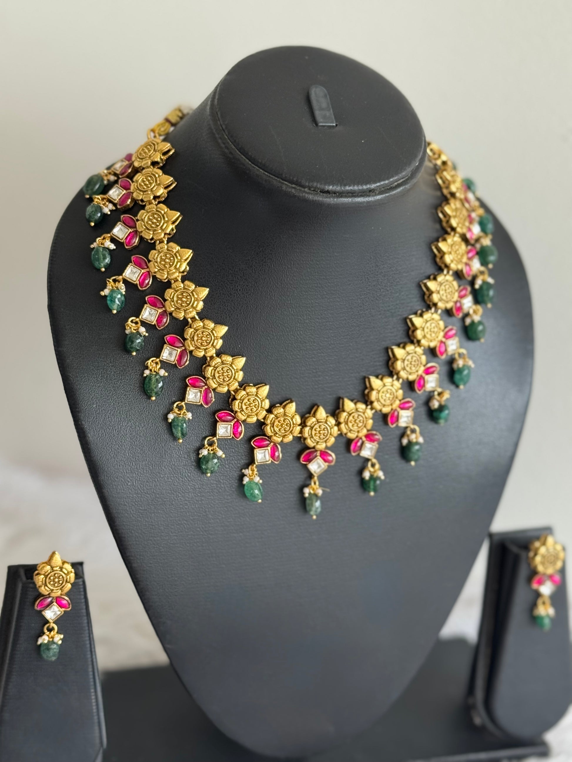 Matte finish pink-green kundan jadau beaded flower necklace set dj-51546
