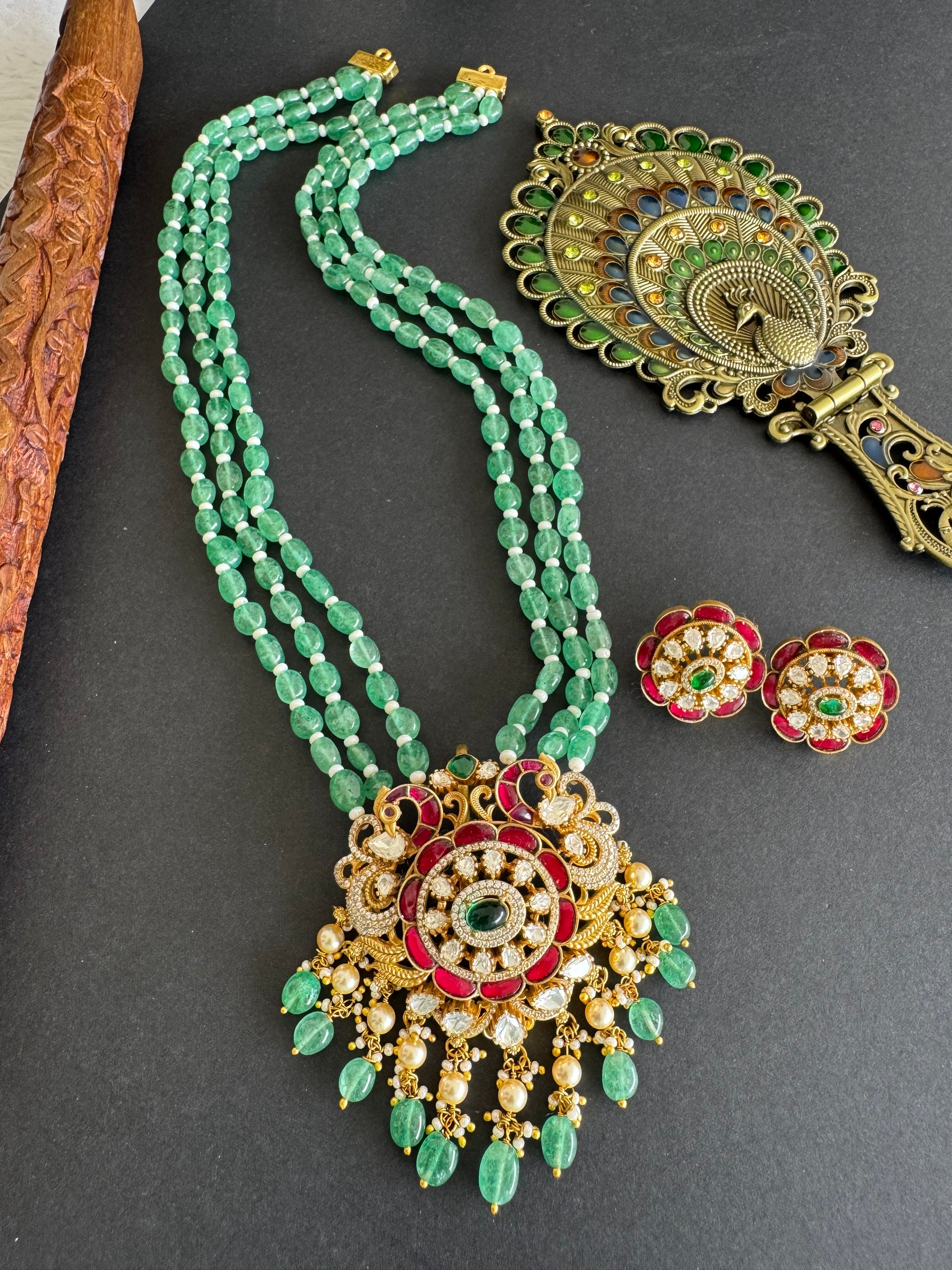 Matte finish pink-green-white kundan jadau green beaded peacock haar set dj-52234