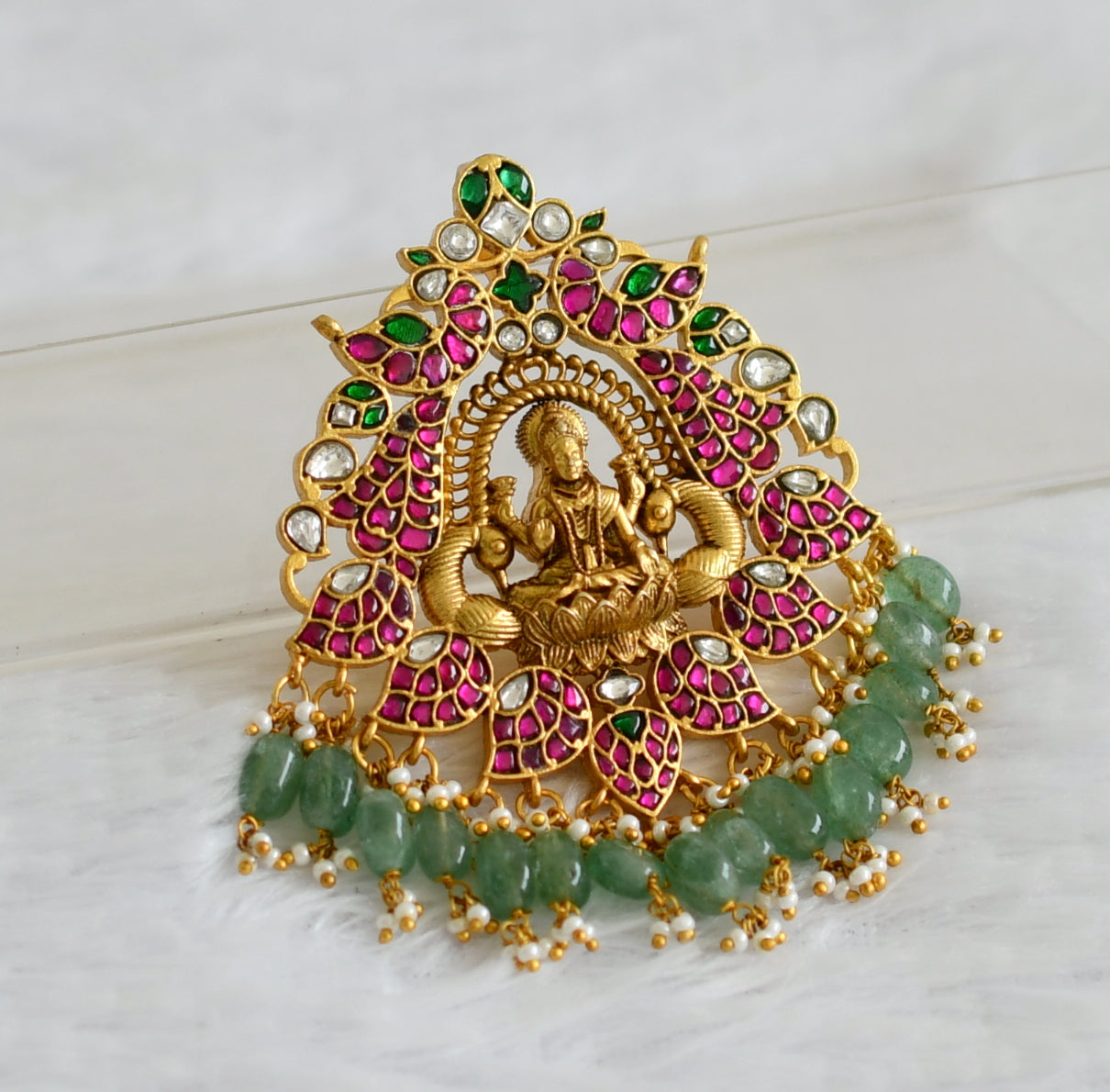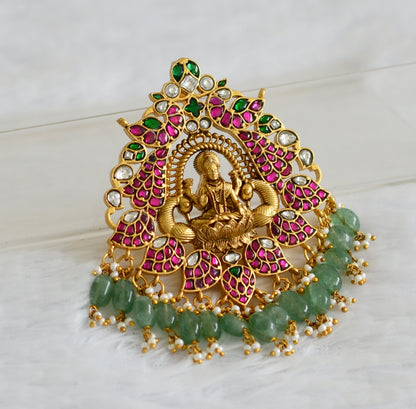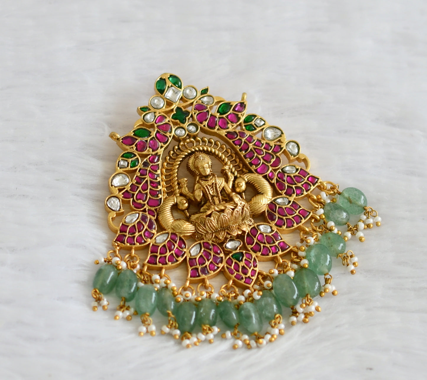 Matte finish pink-green-white kundan jadau lakshmi peacock green bead pendant dj-50678