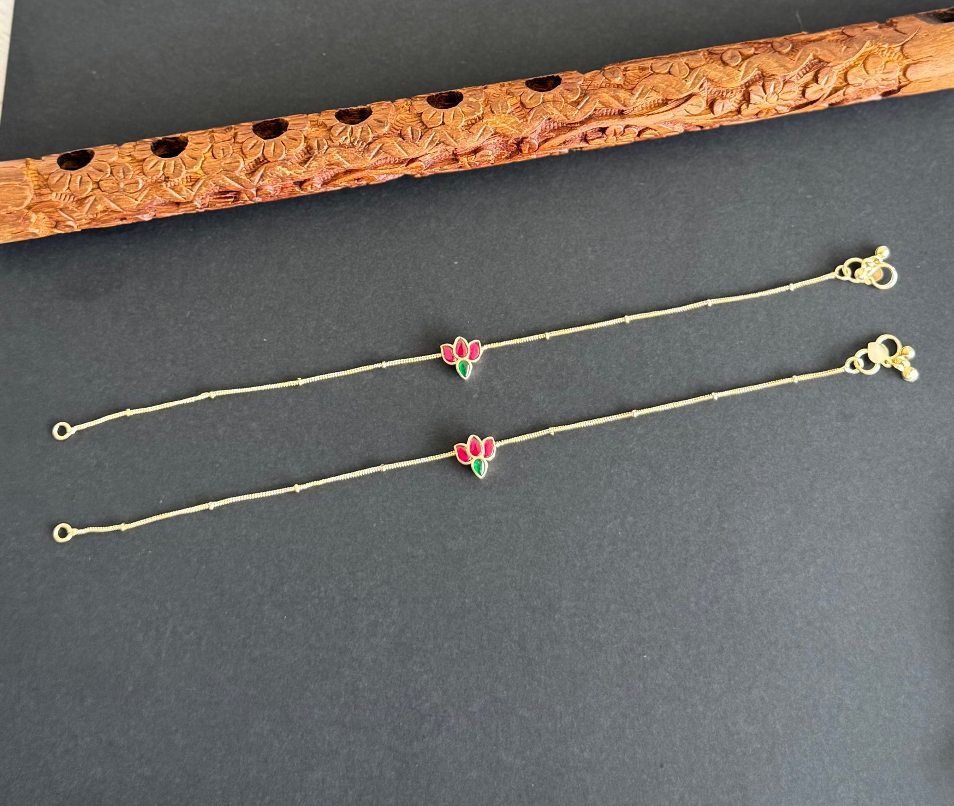 Mild Gold tone pink-green lotus kundan jadau anklets dj-51434