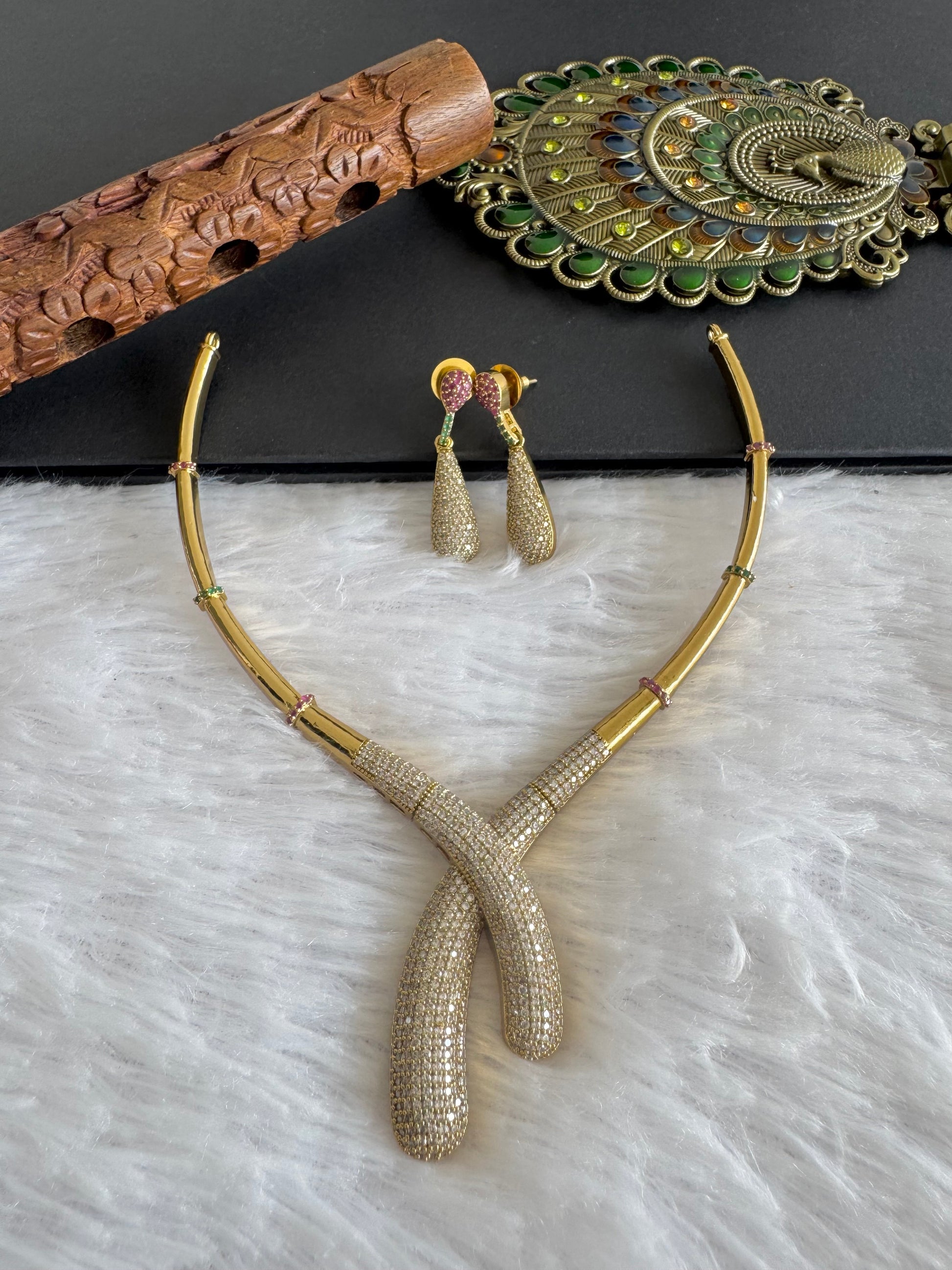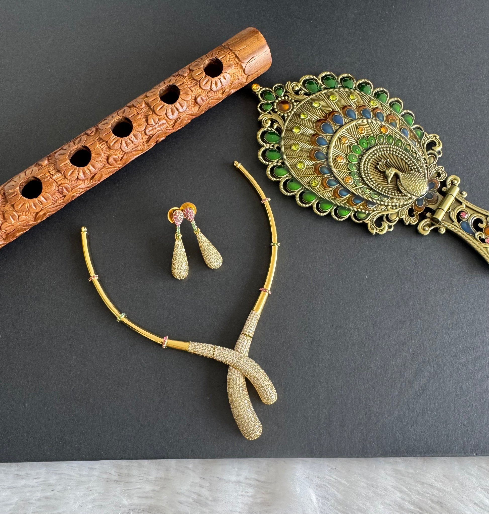 Antique gold tone cz pink-green-white kante necklace set dj-52124
