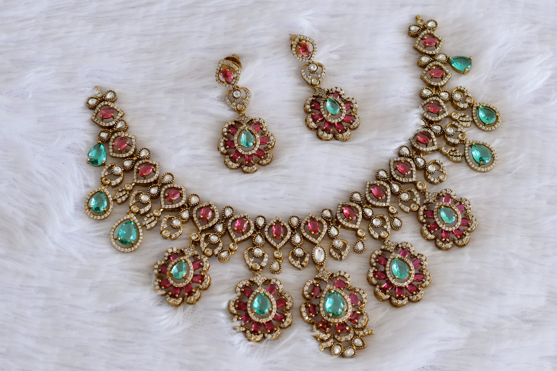 Antique gold tone cz pink-sea green flower necklace set dj-53030