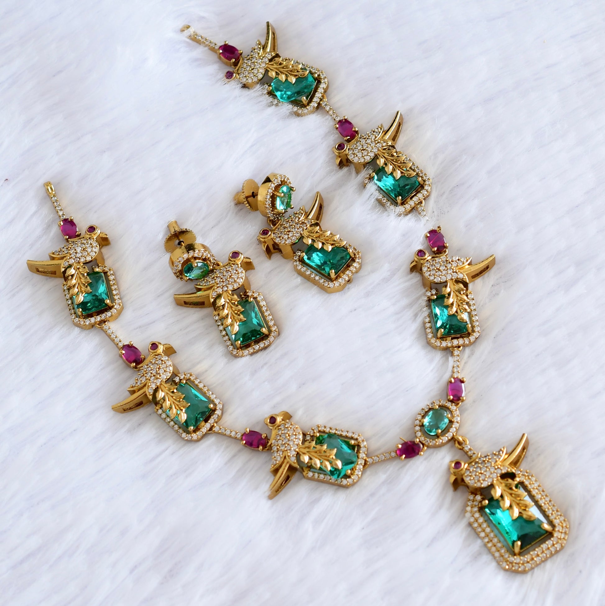 Antique gold tone cz pink-sea green-white bird necklace set dj-53021