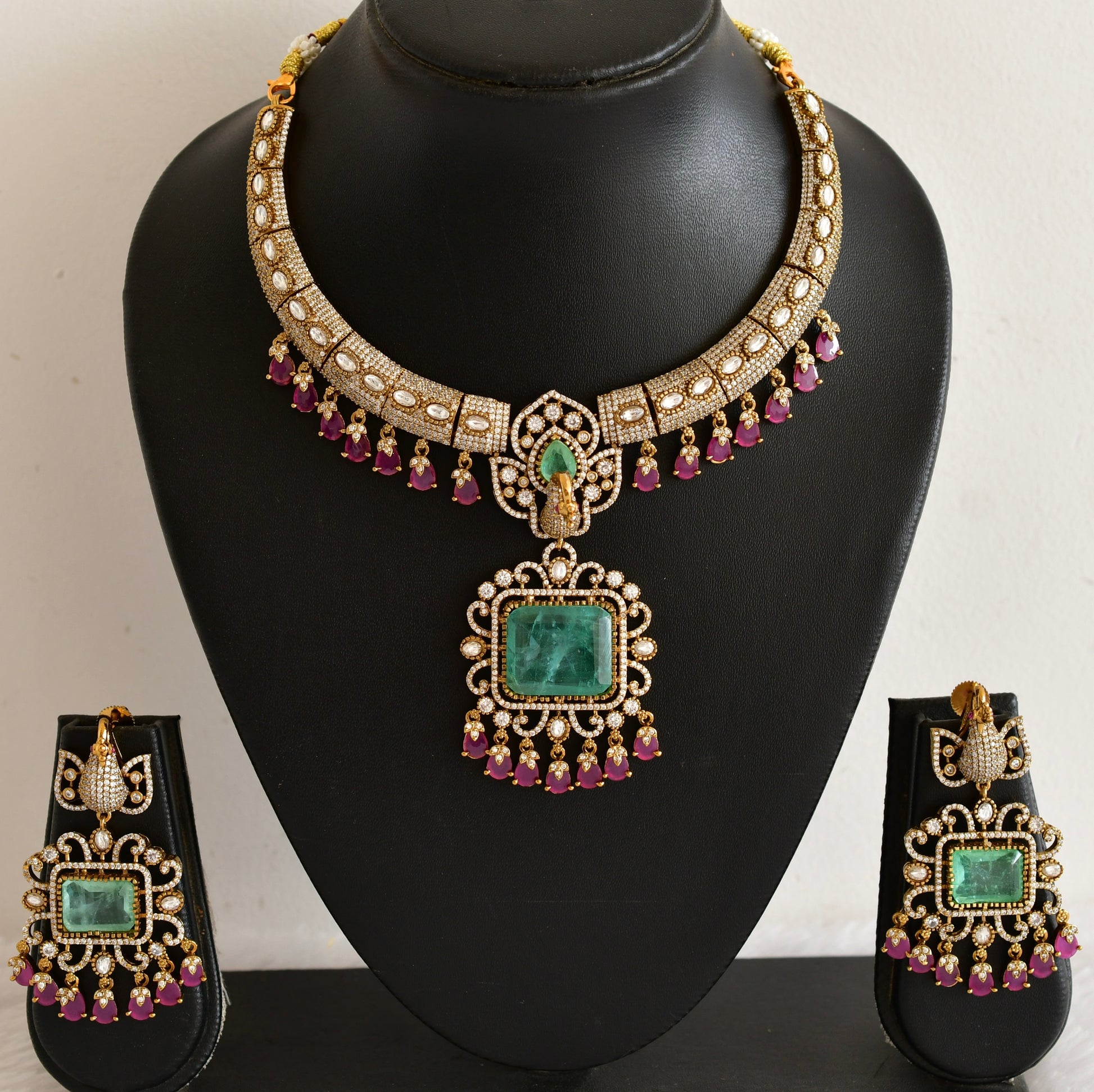 Antique gold tone cz ruby-sea green peacock necklace set dj-53026