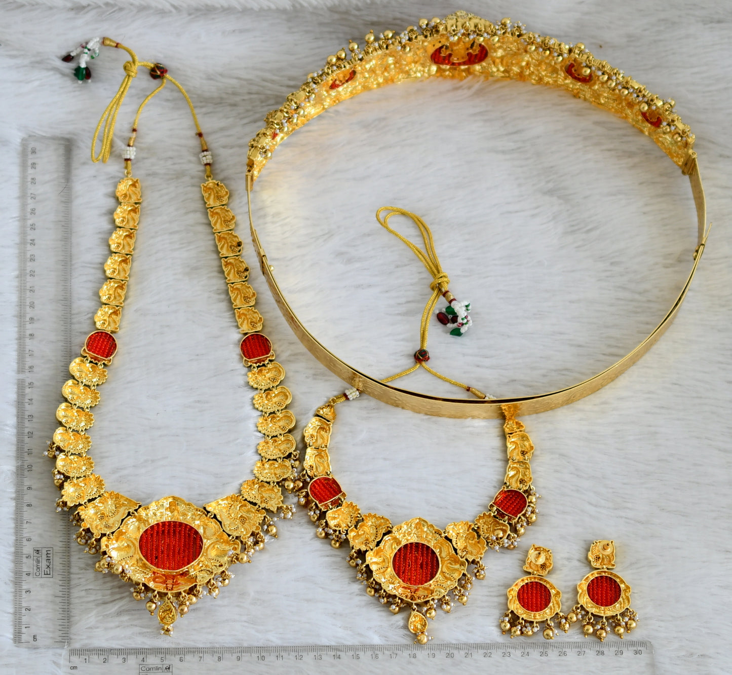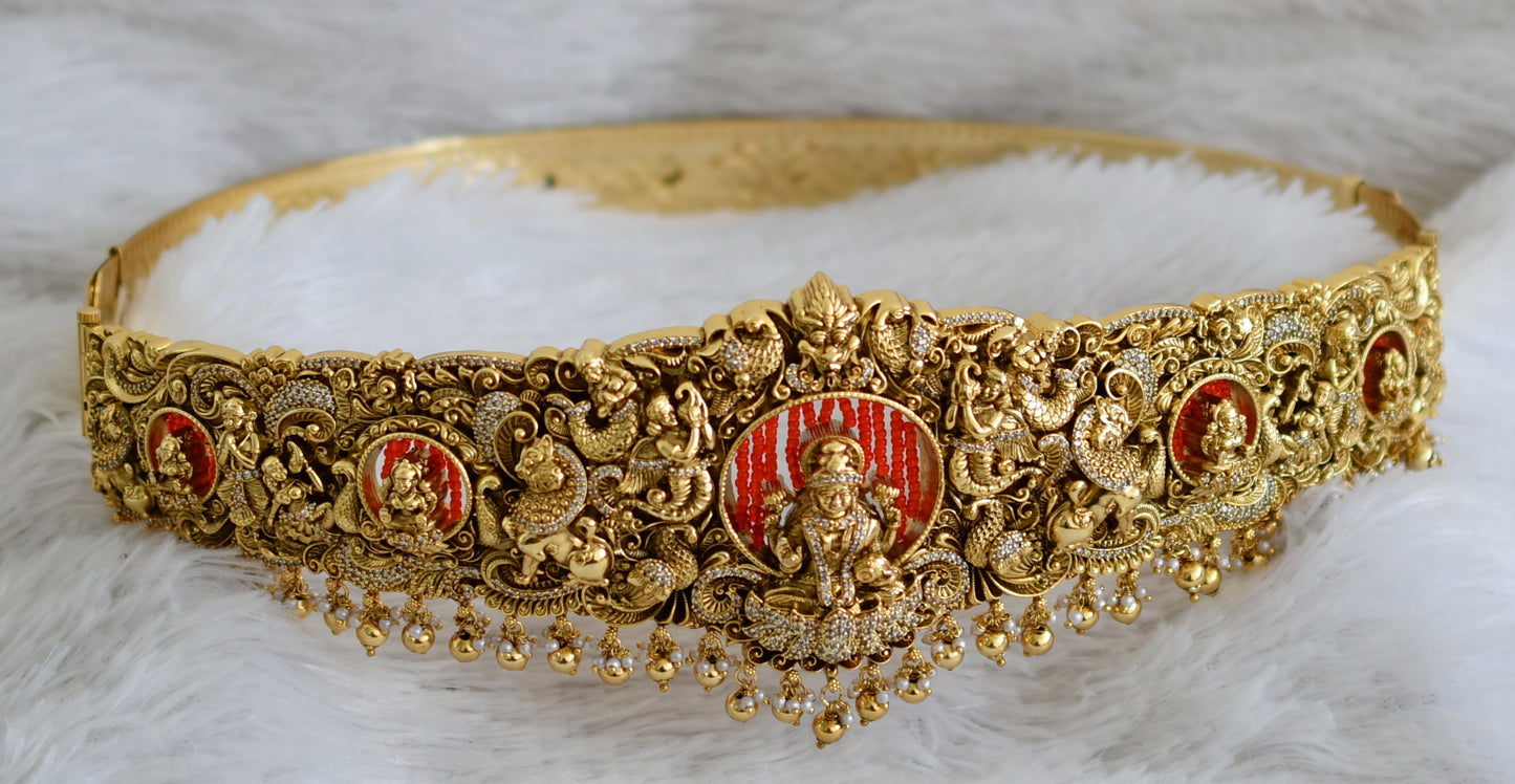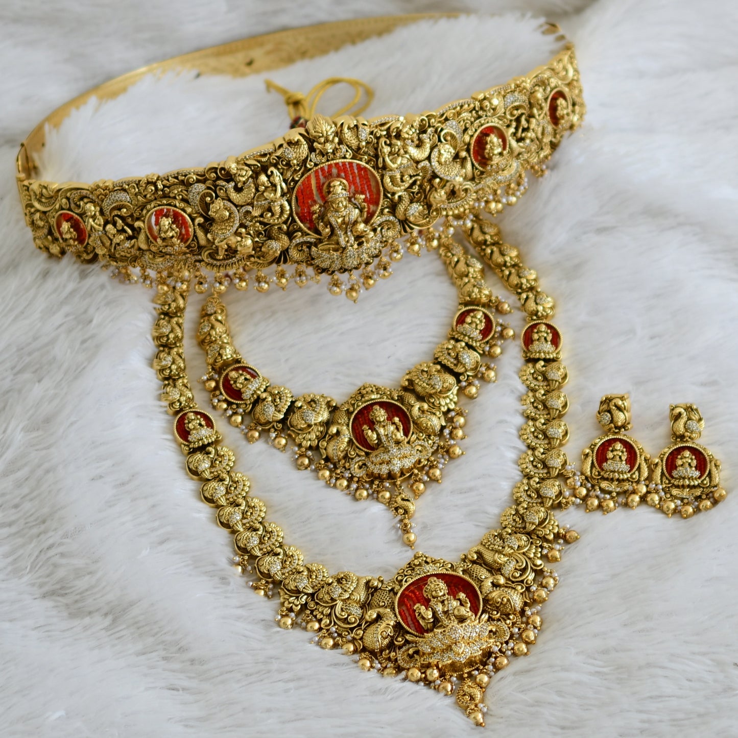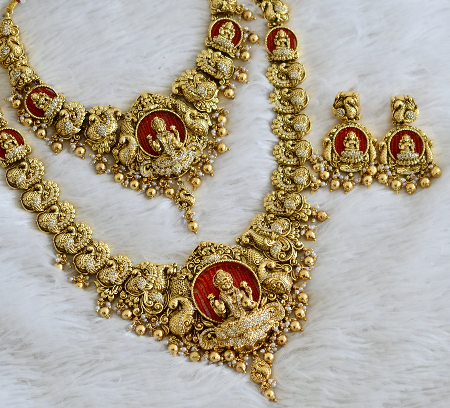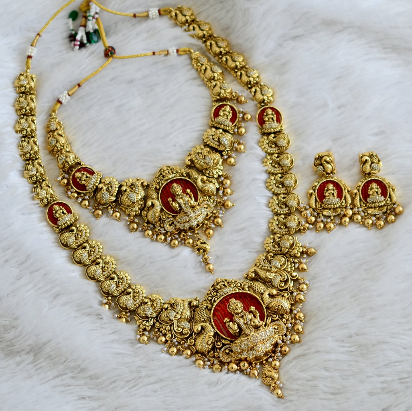Antique gold tone cz white stone red bead lakshmi peacock bridal set dj-49067