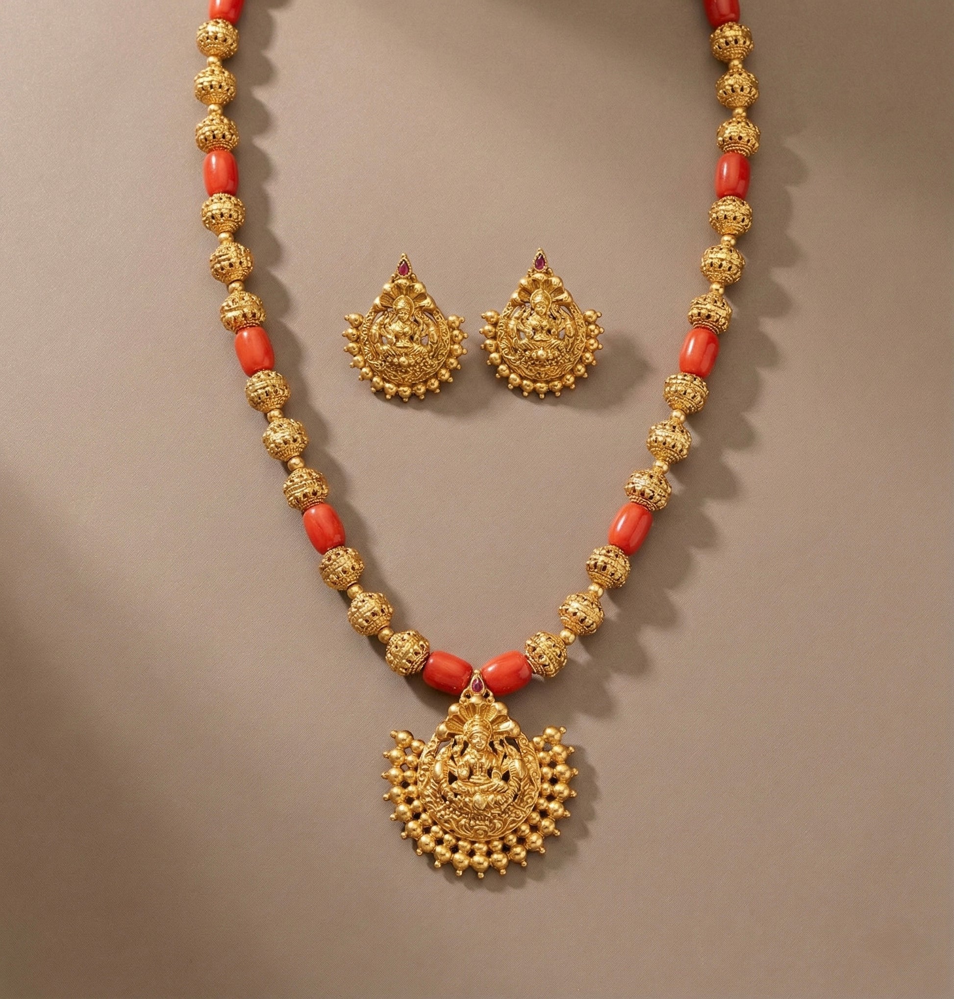 Antique gold tone flower coral beaded lakshmi necklace set dj-52694