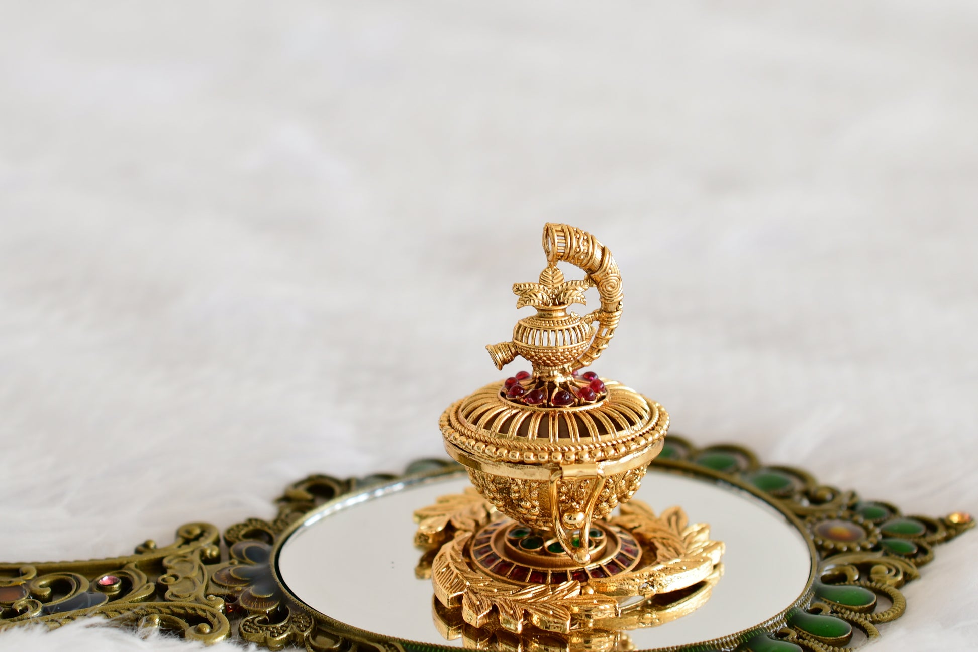 Antique gold tone kemp-green Kalash kumkum box dj-52318