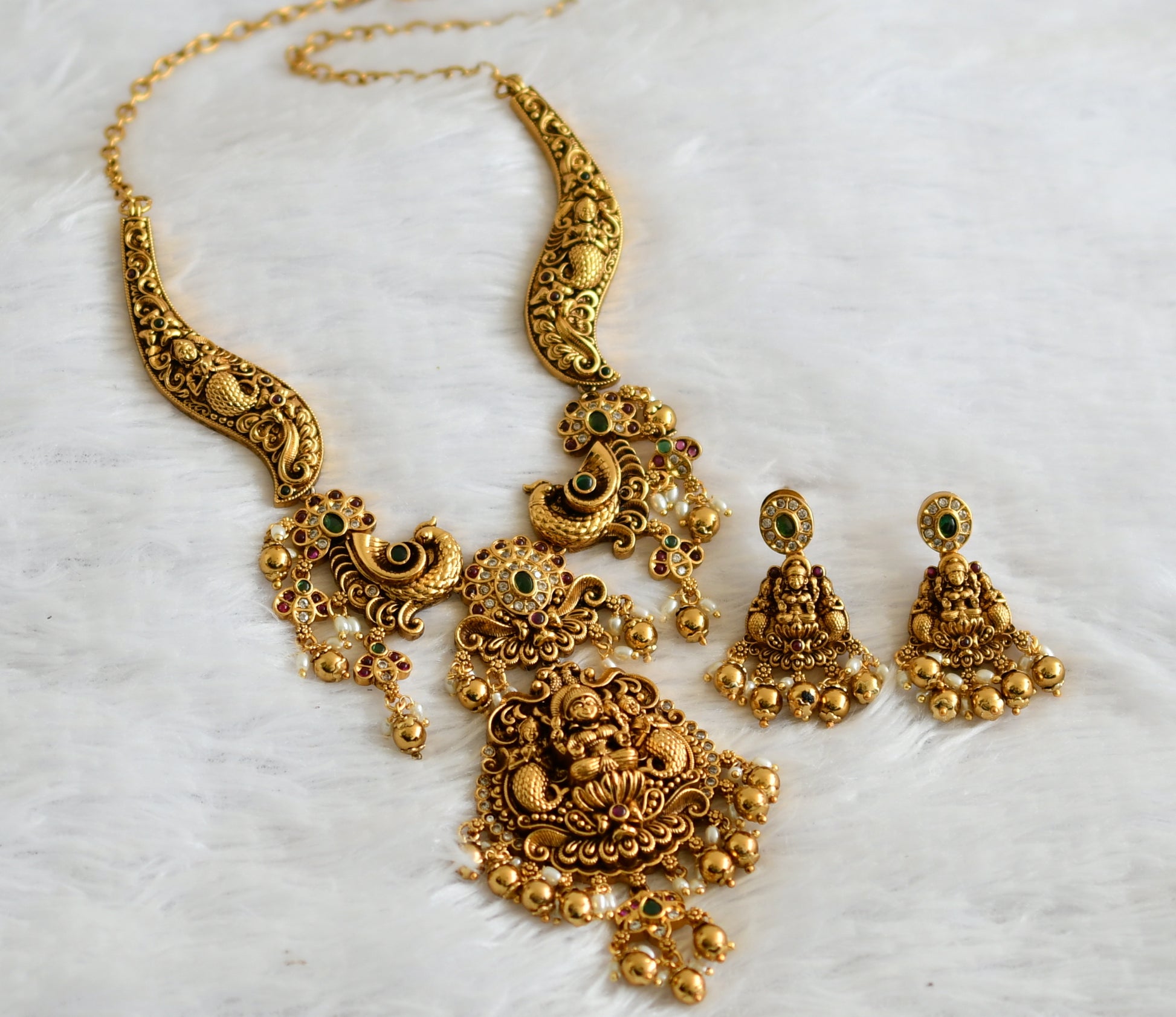 Antique gold tone kemp-green-white lakshmi peacock necklace set dj-50837