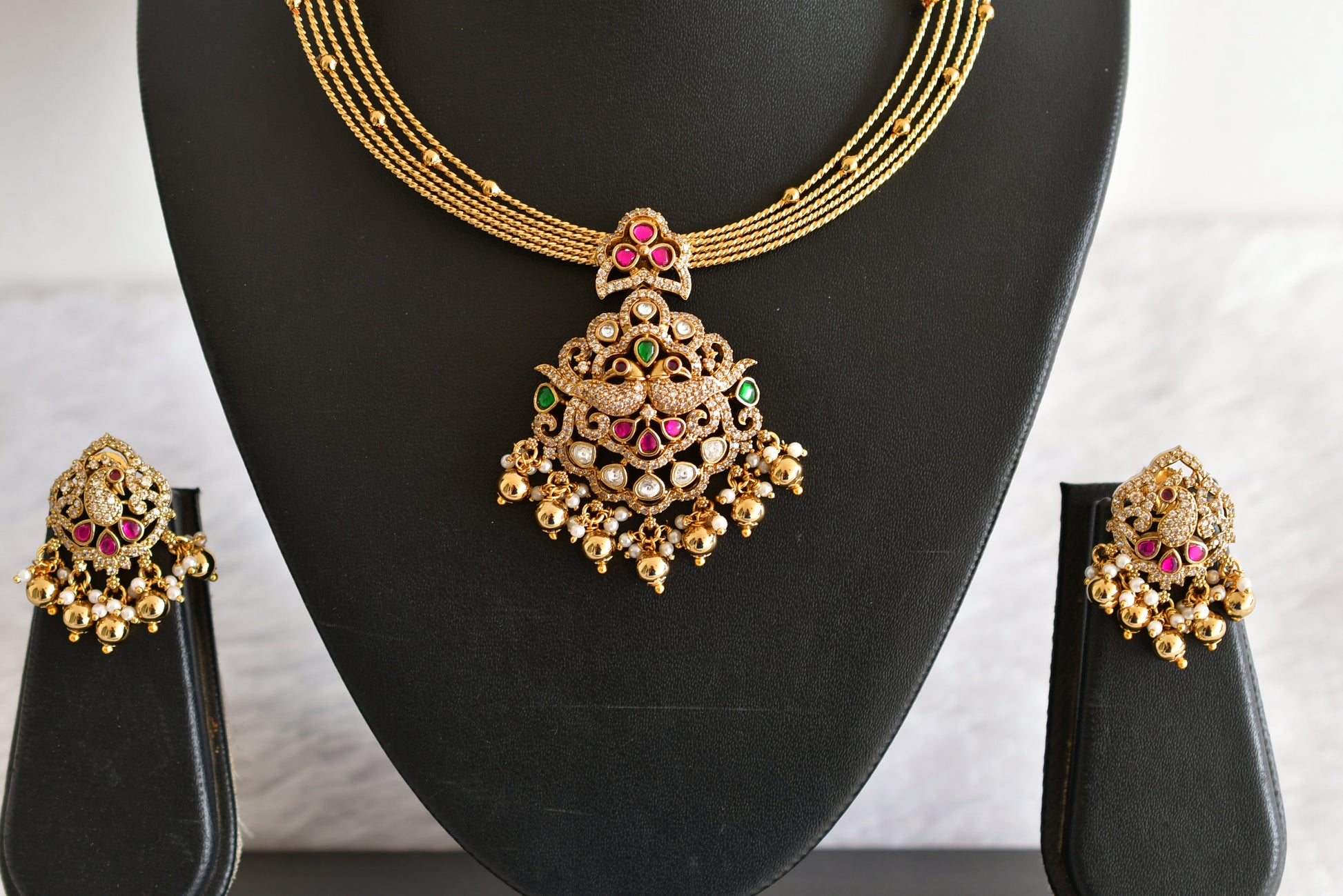 Antique gold tone pink-green kundan jadau kante necklace set dj-52419
