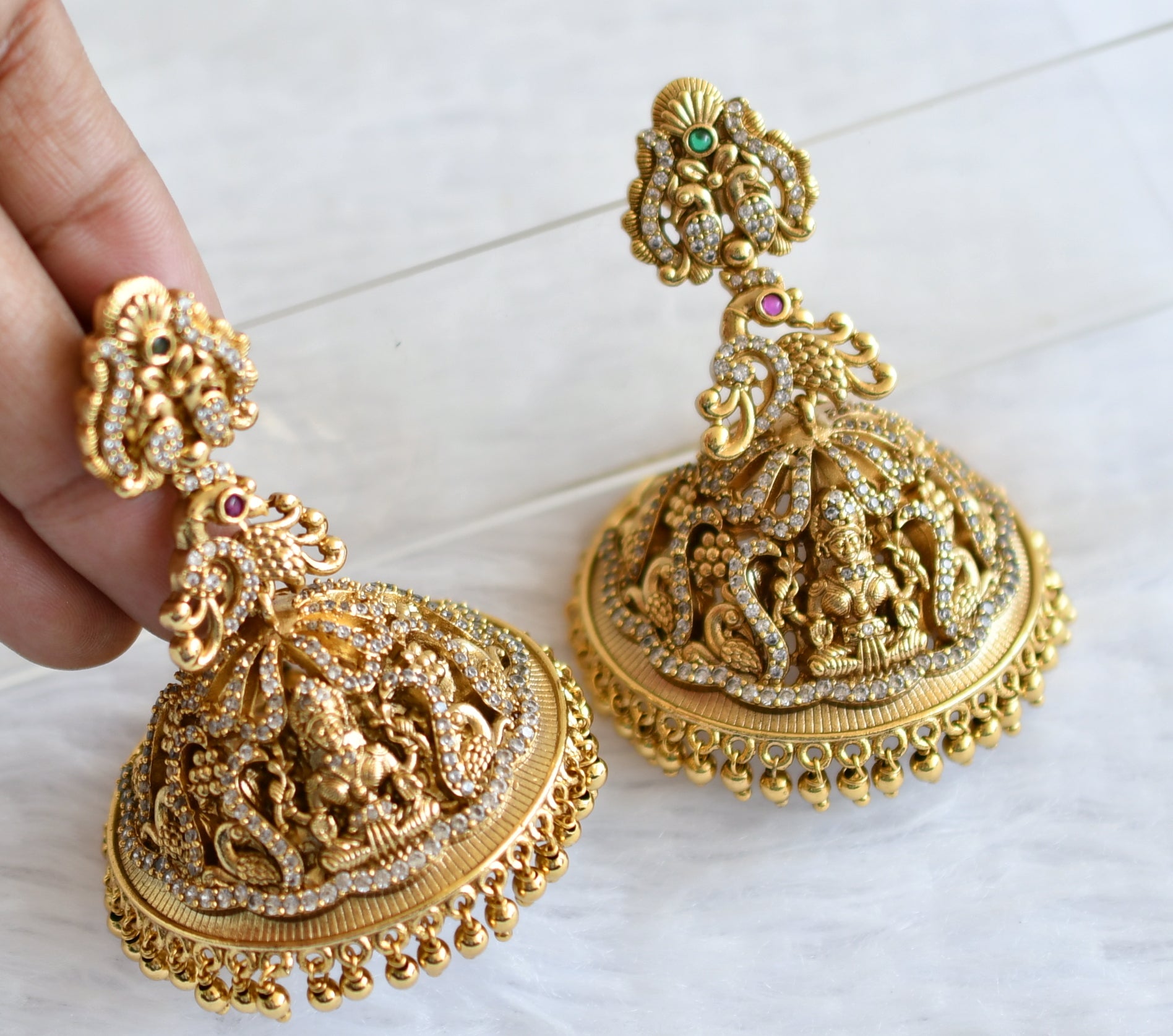 Antique goldd tone cz white lakshmi peacock big jhummka dj-50748