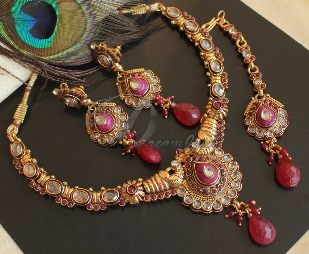 Antique gold tone Ruby Kundan Necklace Set With Tikka DJ24156