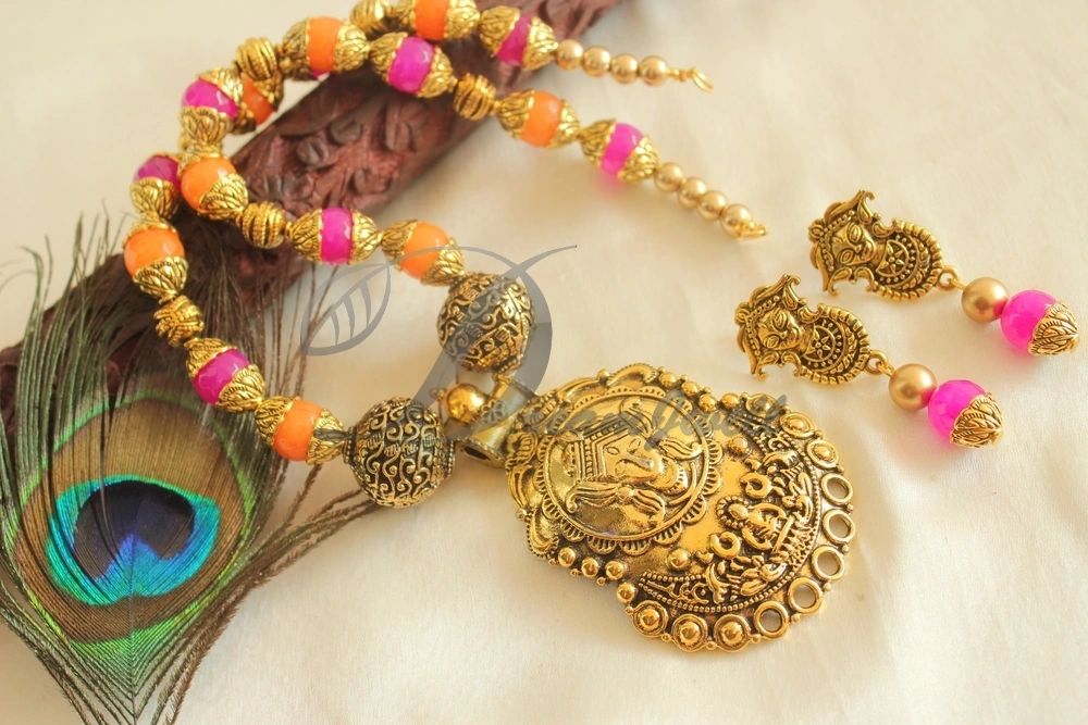 Antique gold tone Ma-durga Pink-orange Agates beaded Necklace Set DJ24678