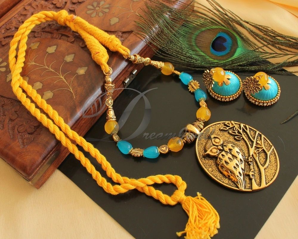Antique gold tone Blue-yellow Owl pendant Necklace Set DJ24801