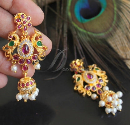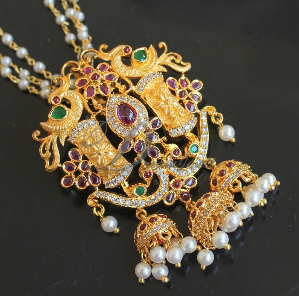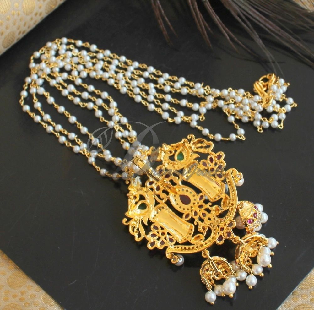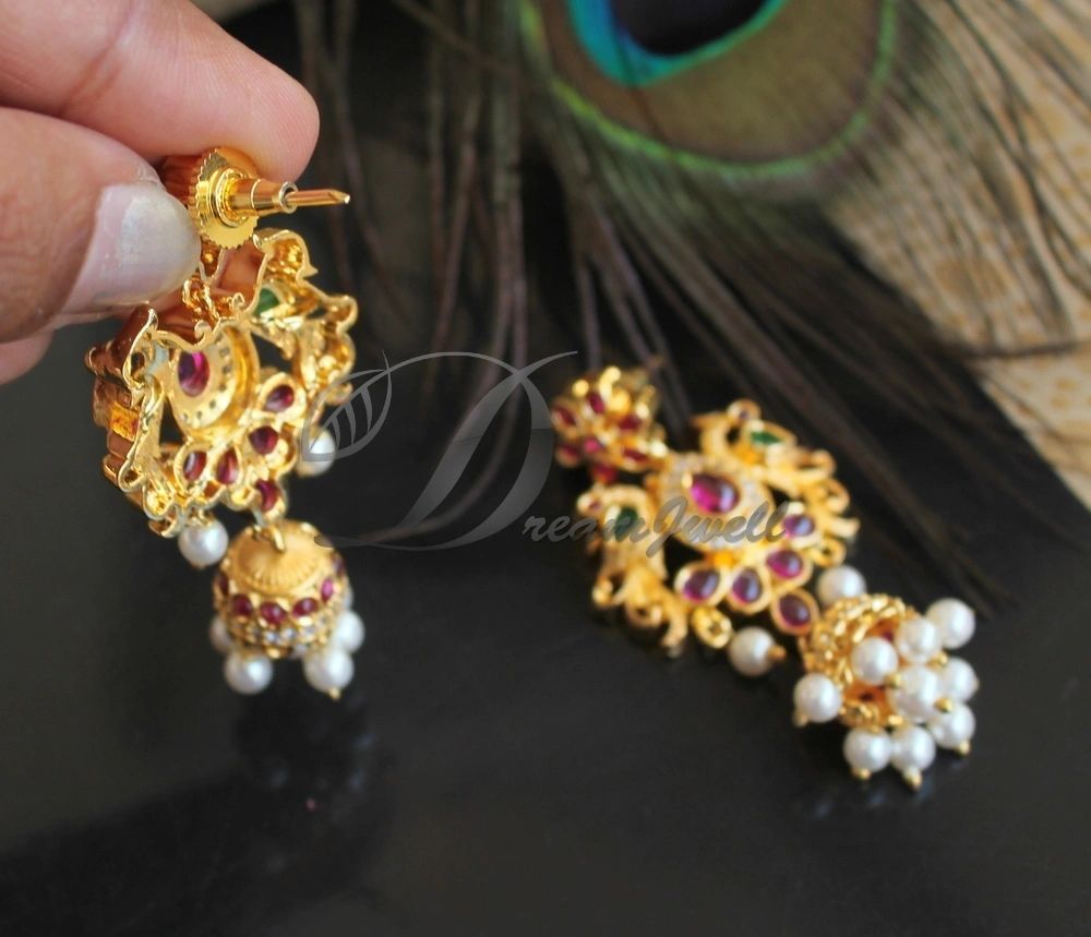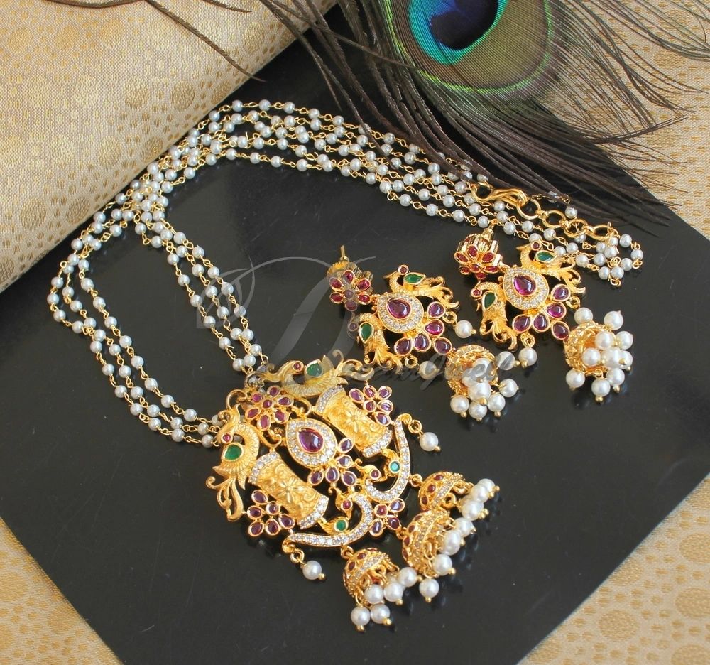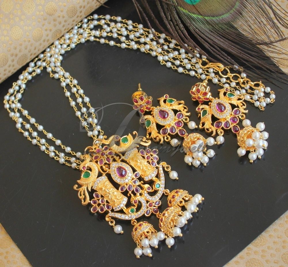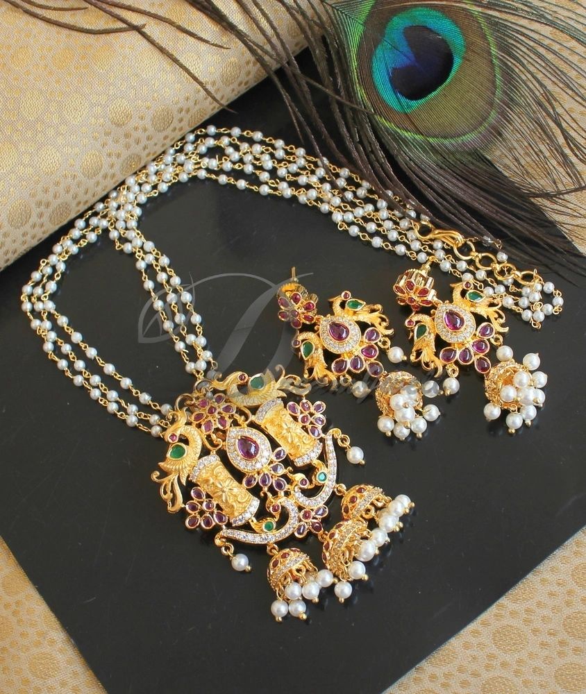 The product includes A Pendant with chain - Length : 28 cm A pair of Earrings - Length : 5 cm , Width : 3 cm Earrings type - Push back Pendant comes with a pearl chain .