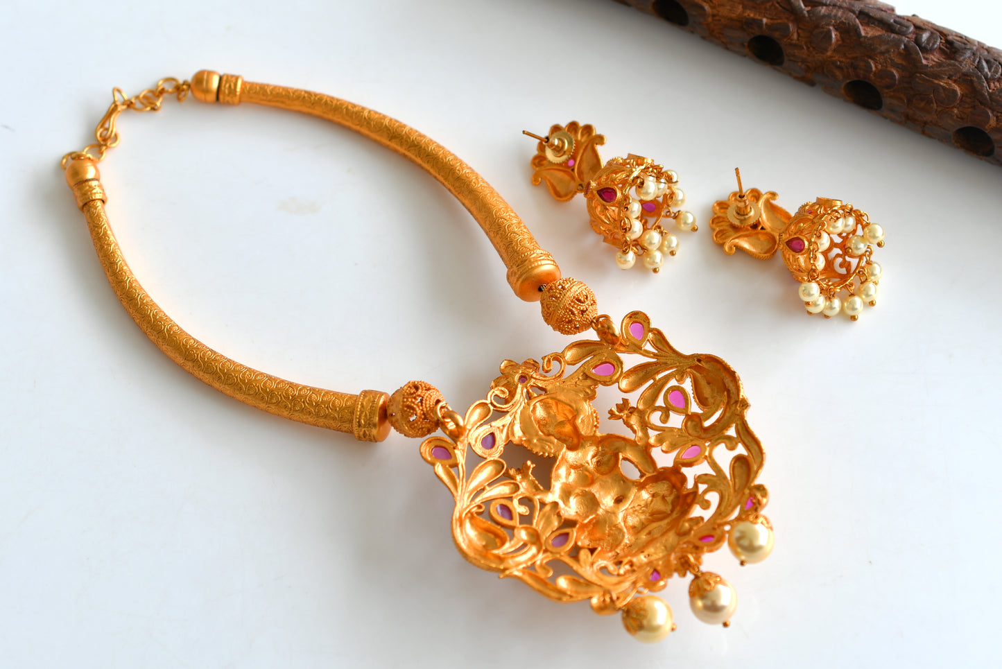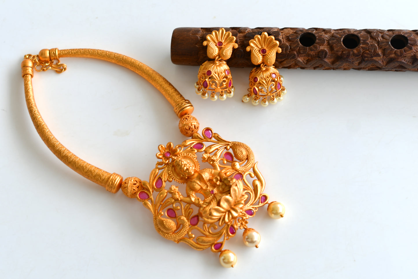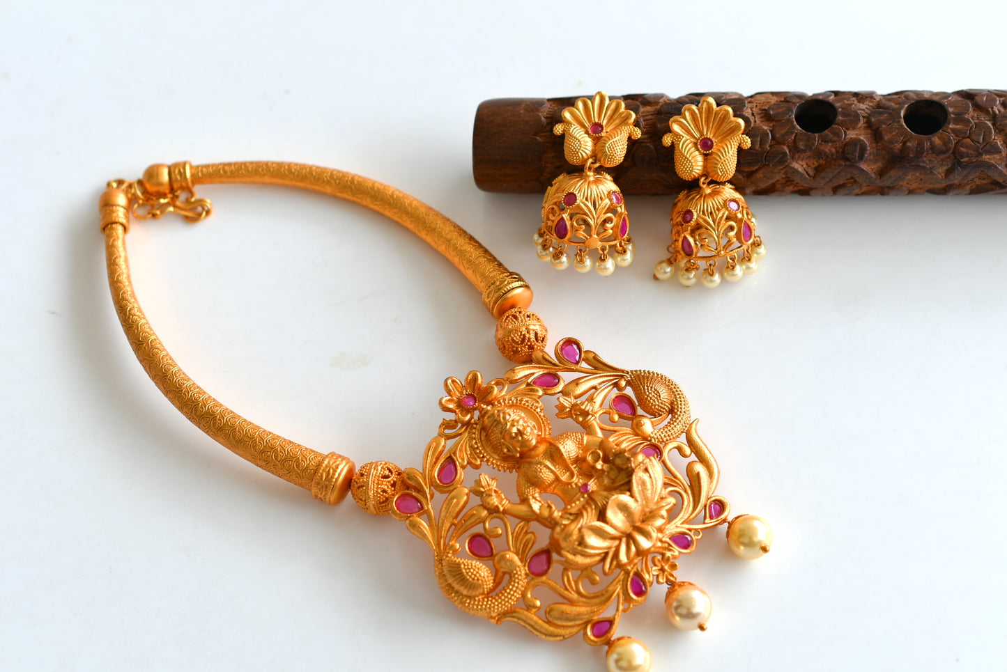 Matte Finish Ruby-Pearl Lakshmi Kante Necklace Set-dj10960