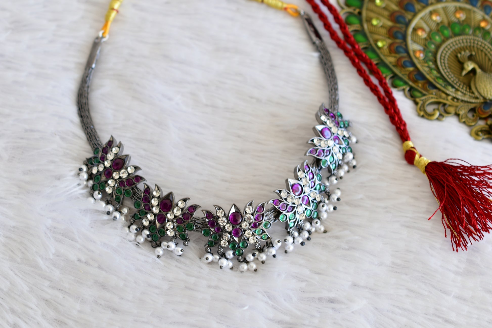 Black finish precious kemp-green pearl lotus necklace dj-52511