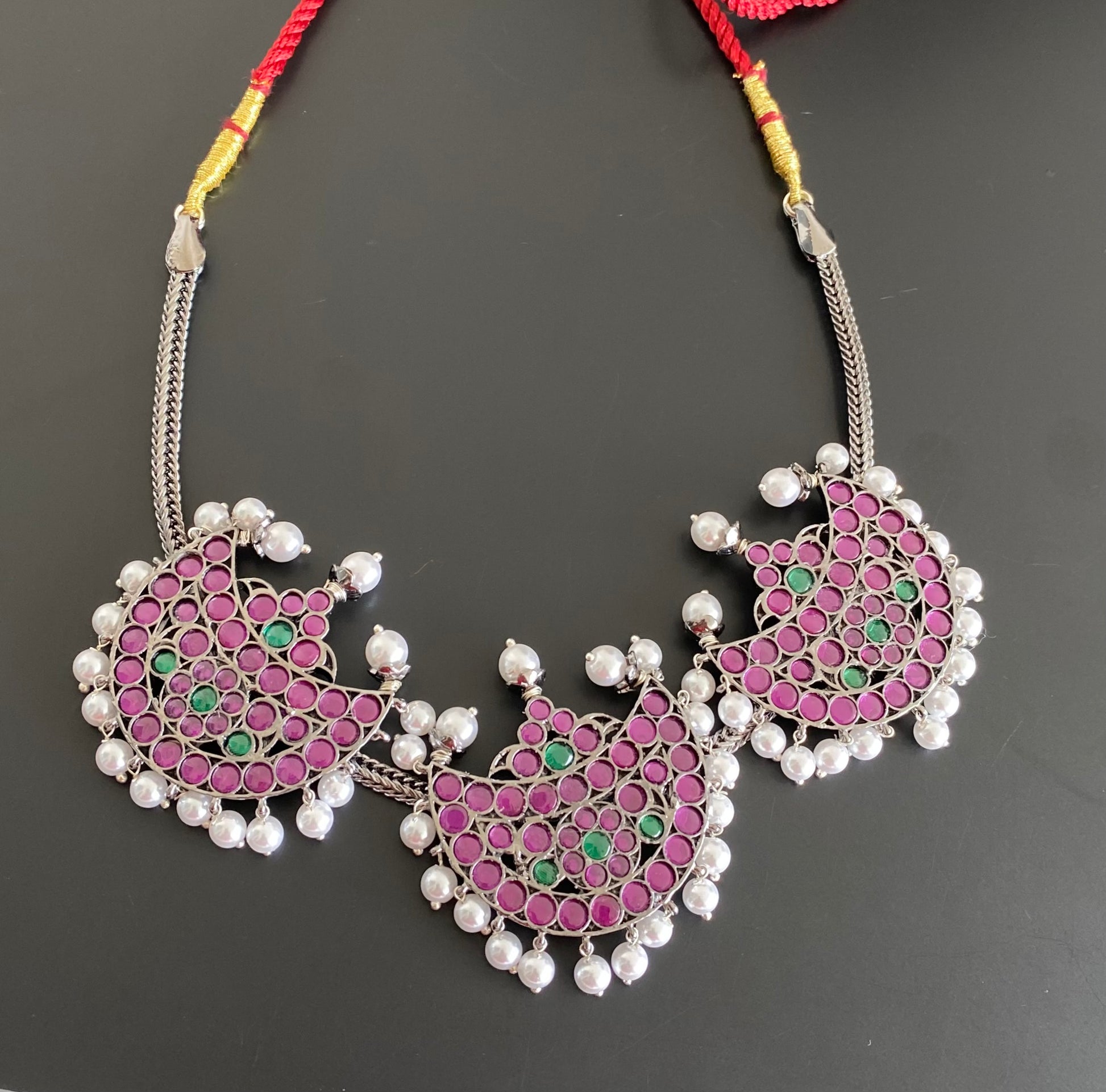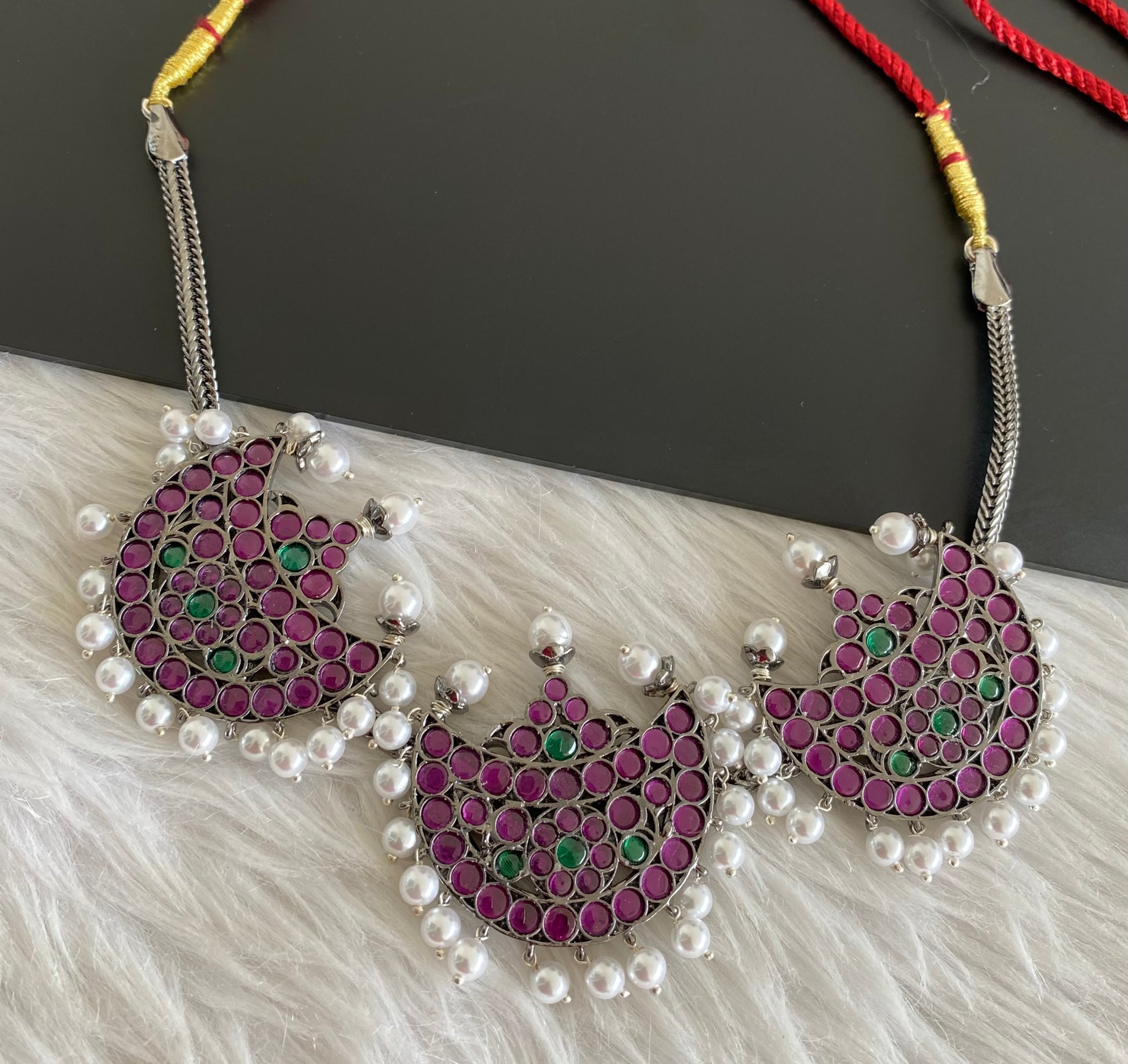 Black finish precious kemp-green pearl moon necklace dj-53001