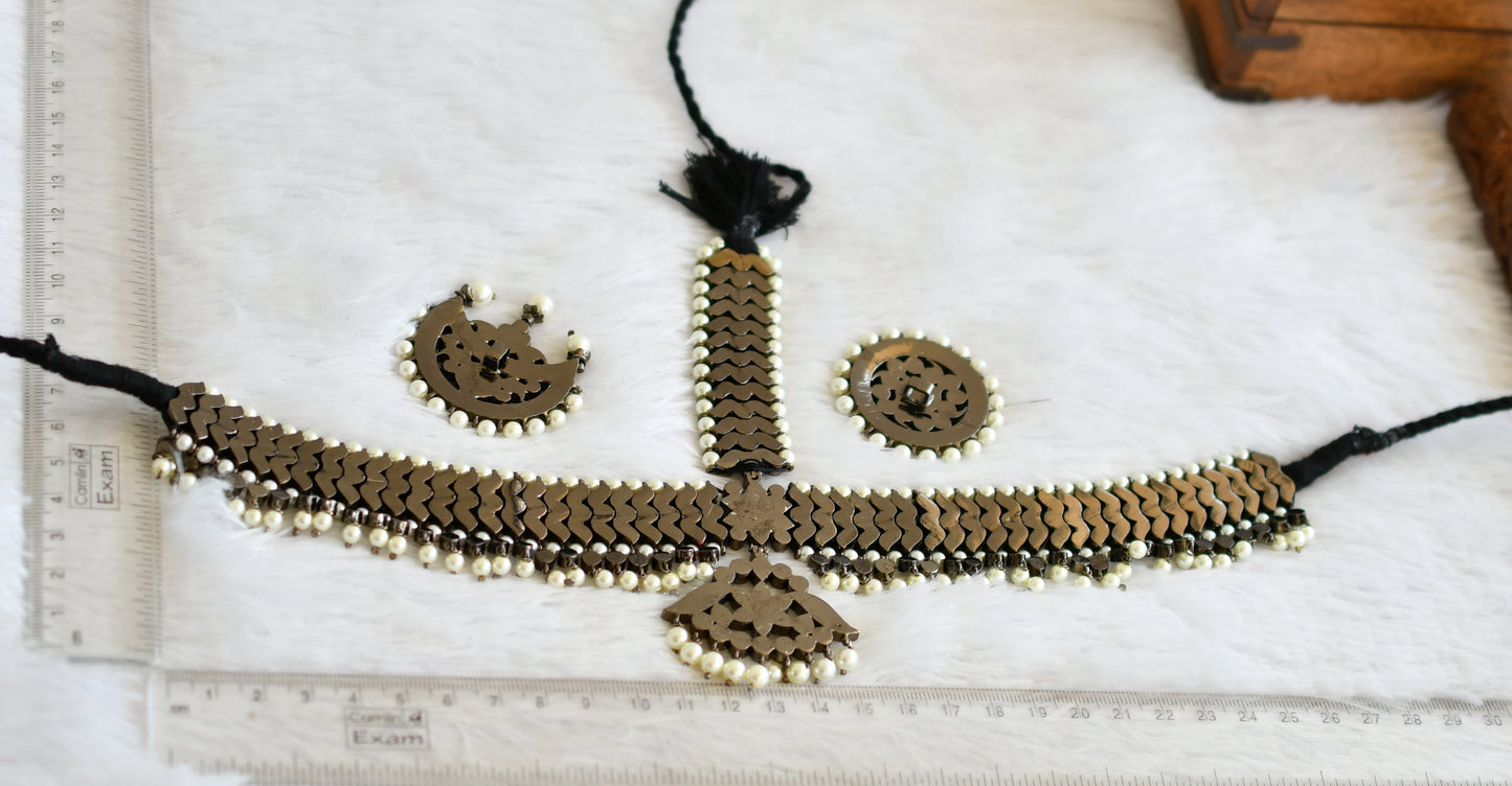 Black finish real kemp-green-white pearl maang tikka dj-50430