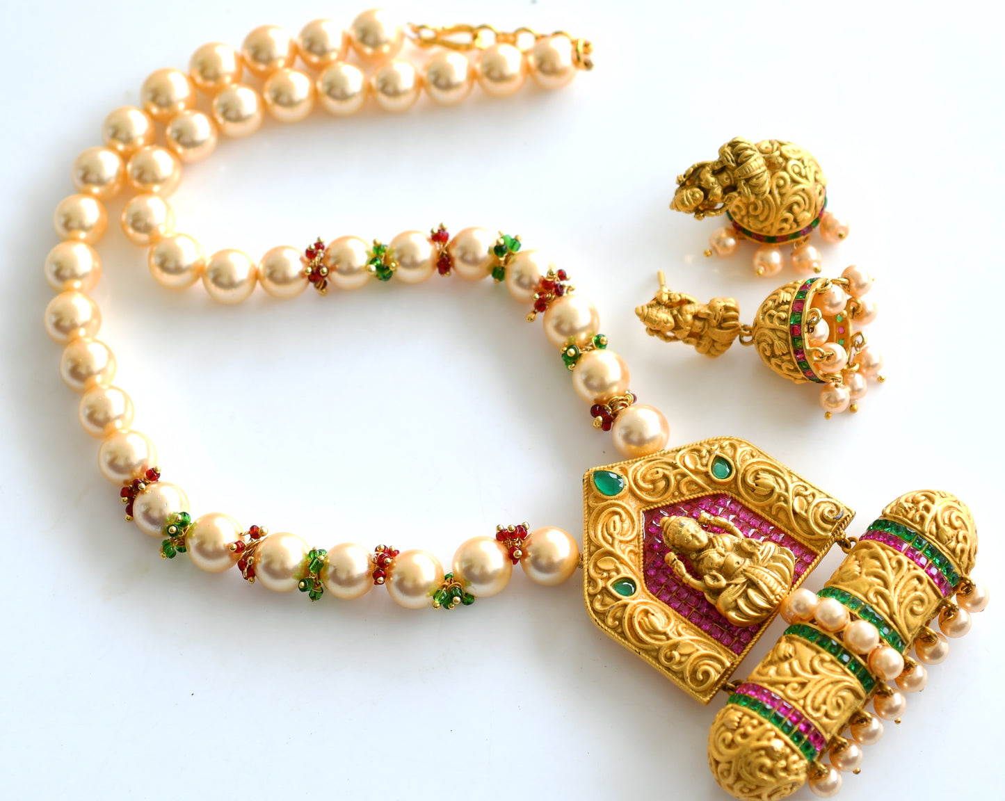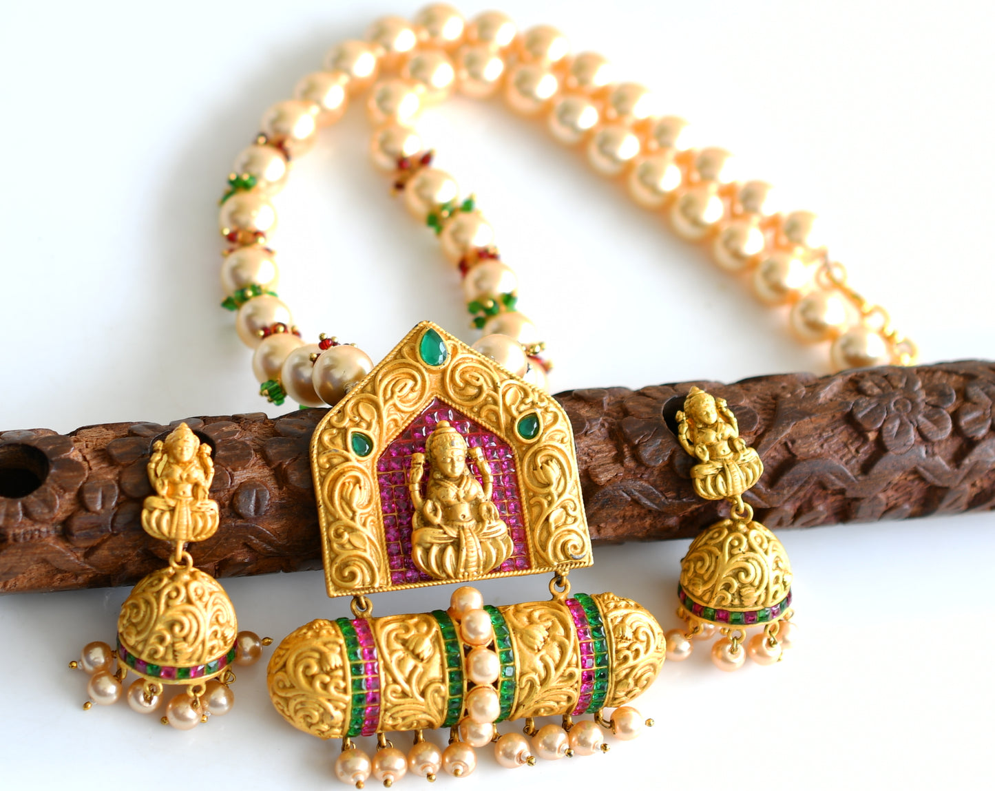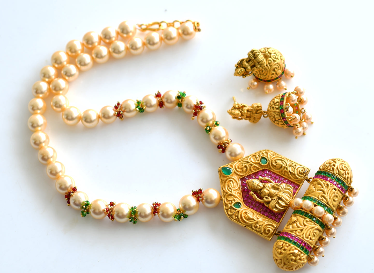 Matte Finish Ruby-emerald Pearl beaded Lakshmi Necklace Set-dj02949