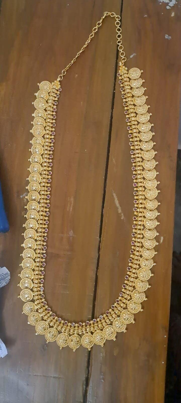 Gold look alike ad pink stone lakshmi coin haar set dj-49094