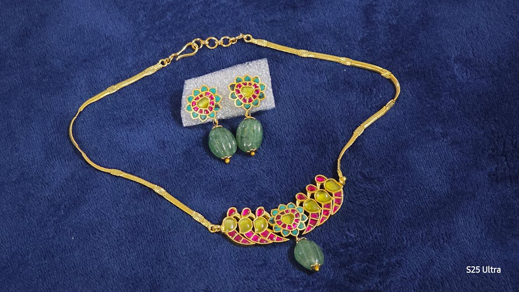 Gold look alike pink-green-blue peacock kundan jadau green beaded choker necklace set dj-50233