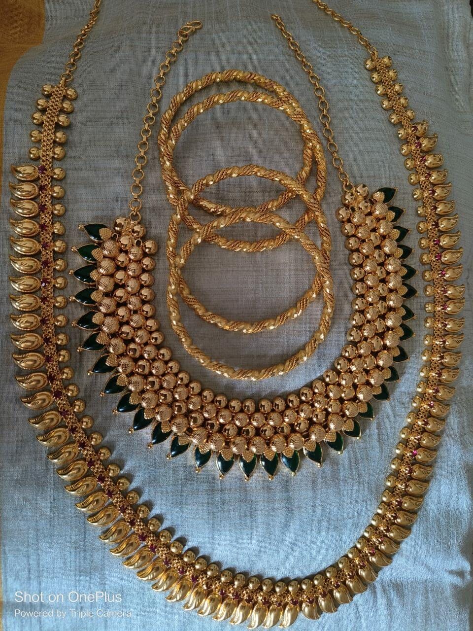Gold replica Gopi shape green Kerala style necklace dj-36397