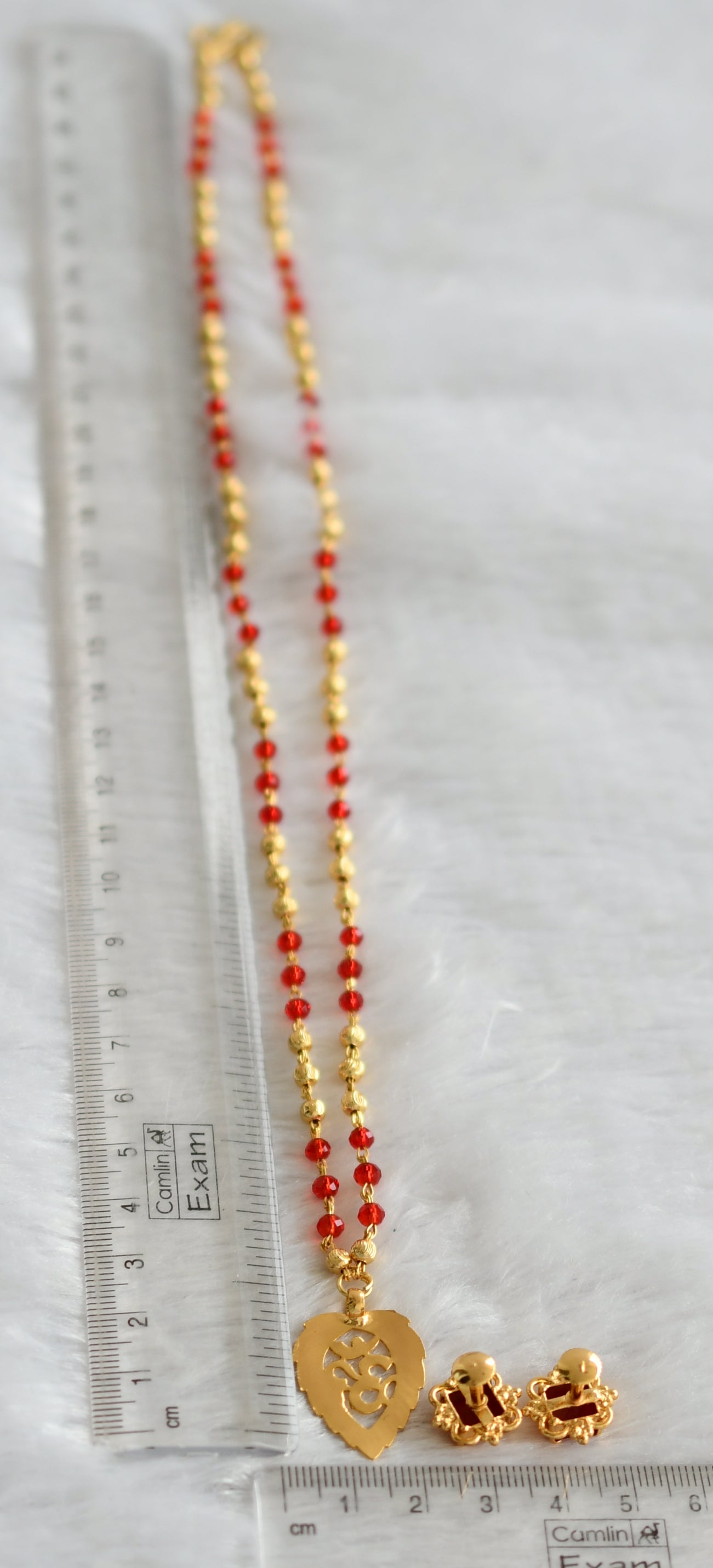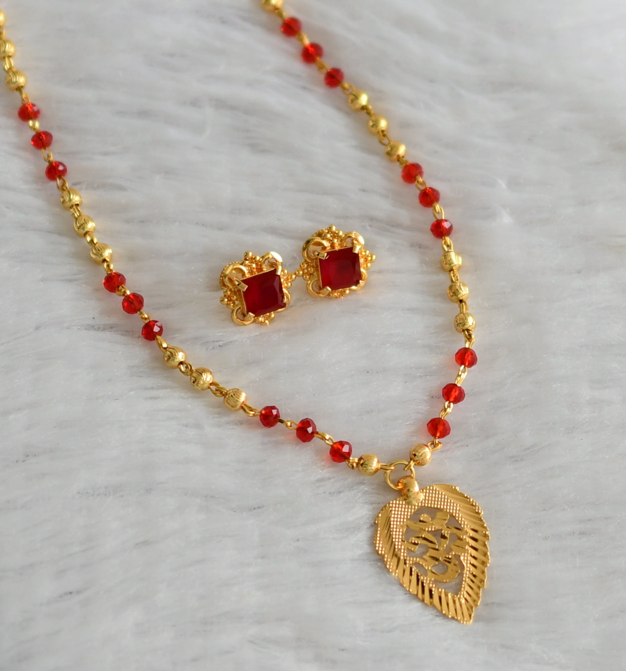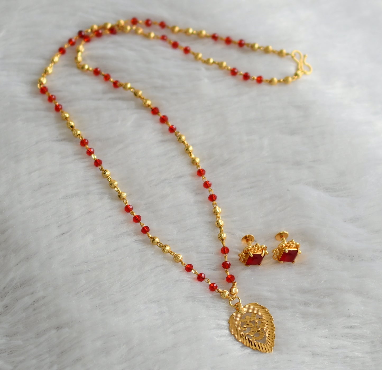 Gold tone 24 inches red beaded chain with om pendant set dj-46746
