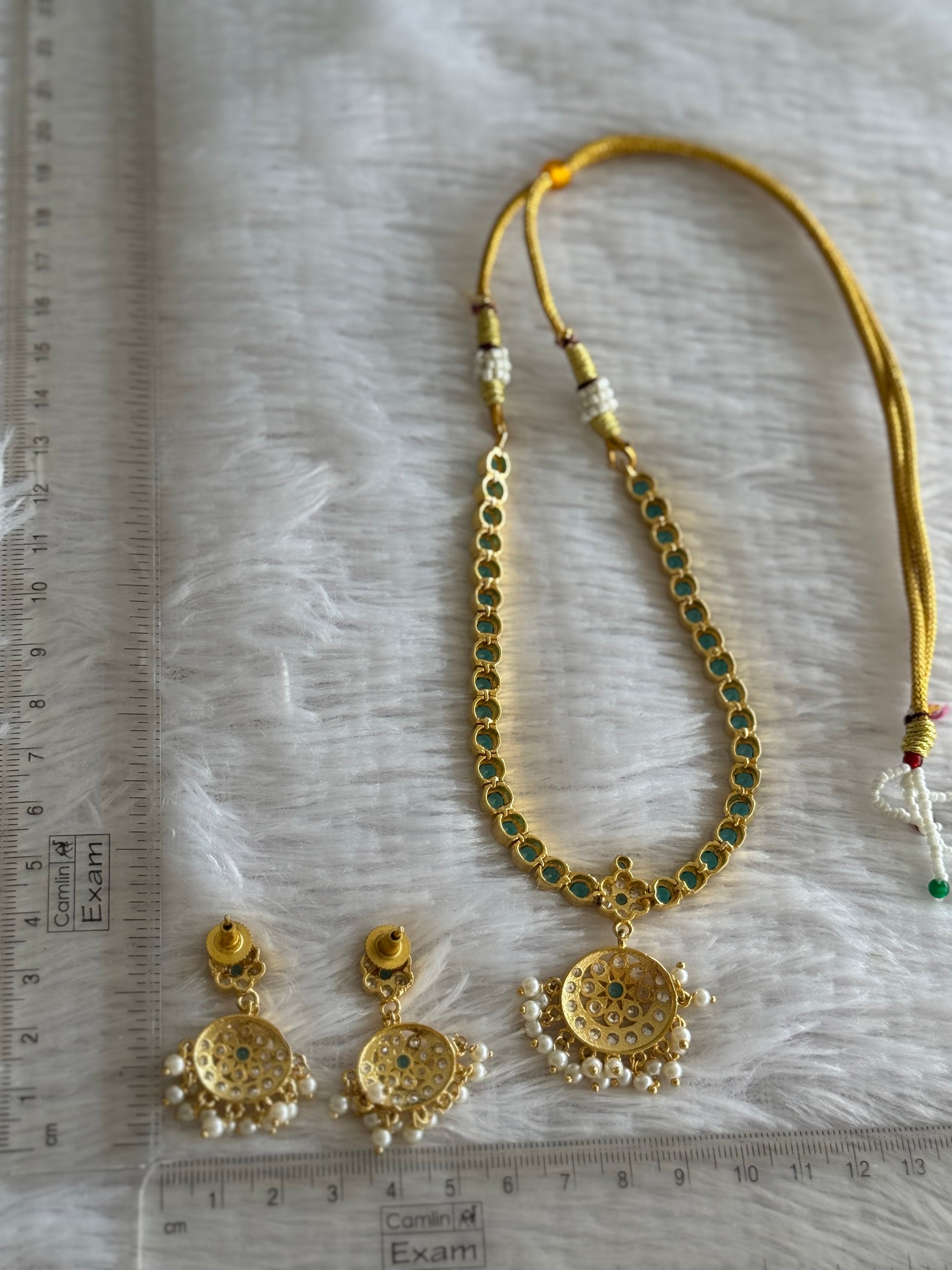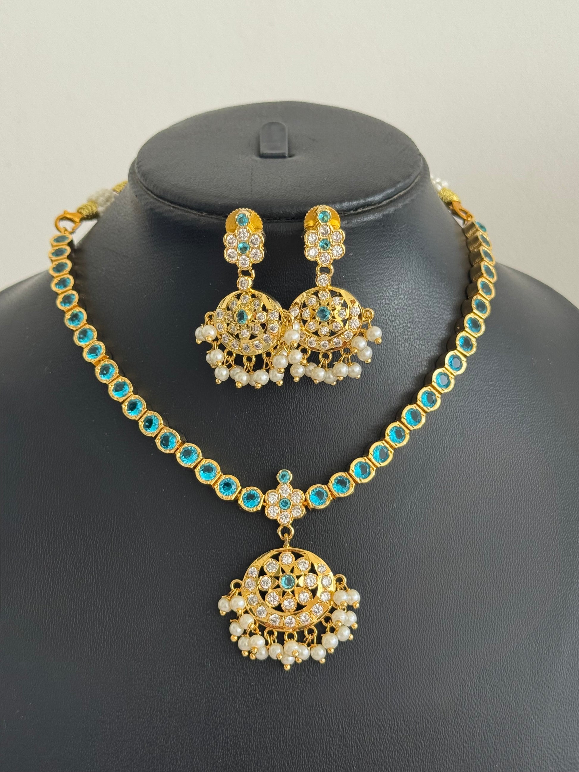 Gold tone AD Cerulean blue south indian style attigai/necklace set dj-51670