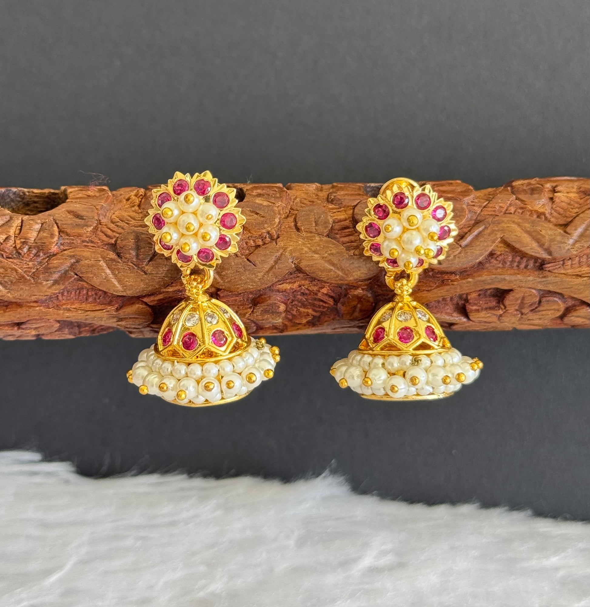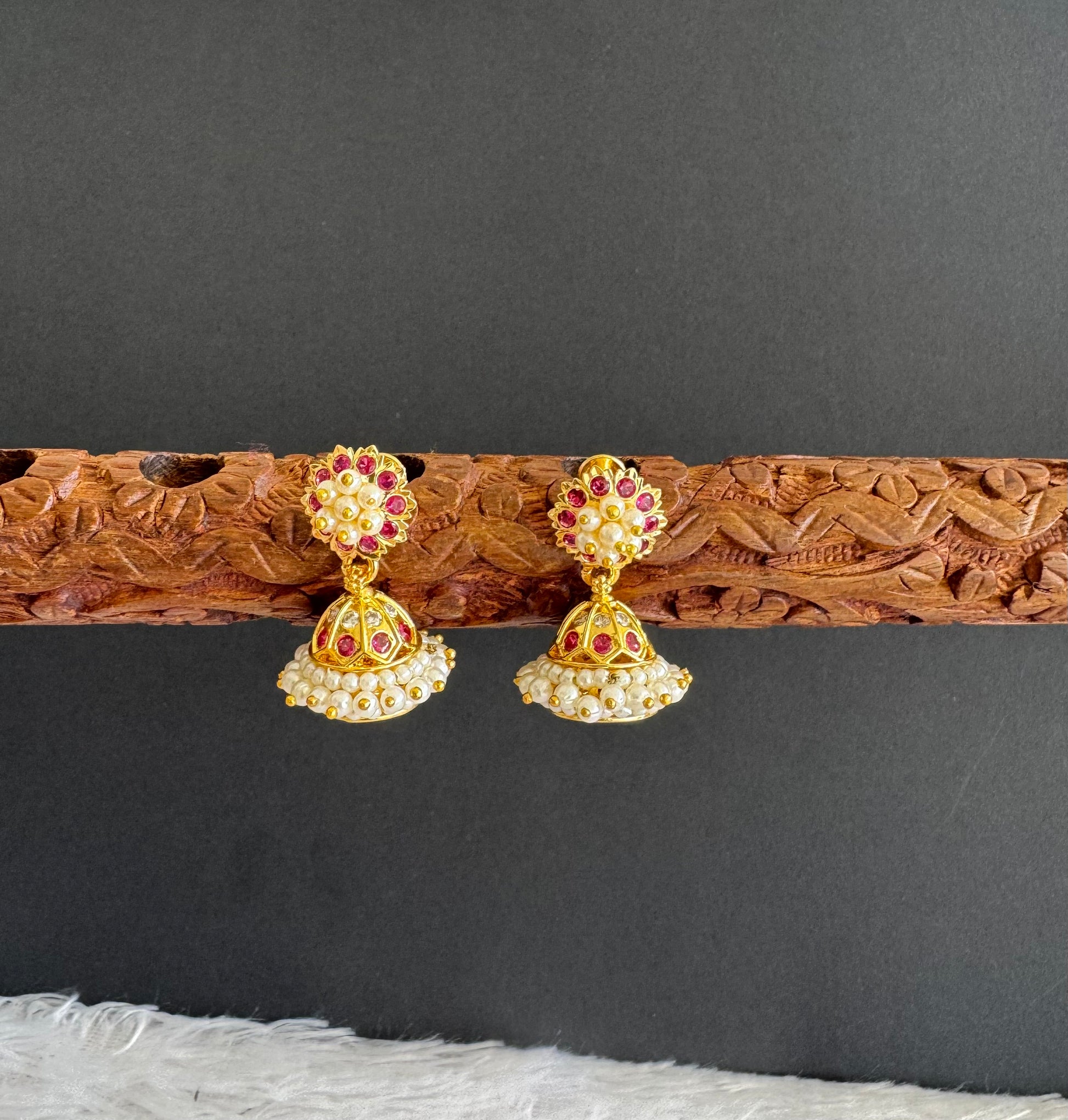 Gold tone ad pink-white stone pearl jhumkka dj-46016