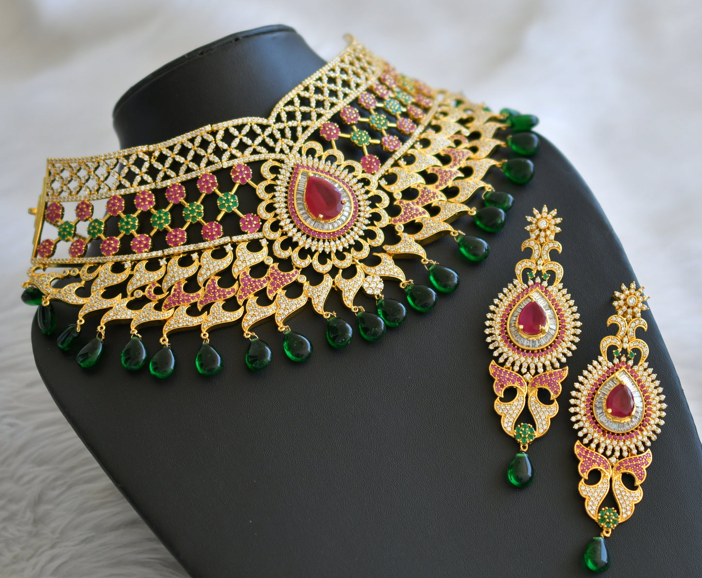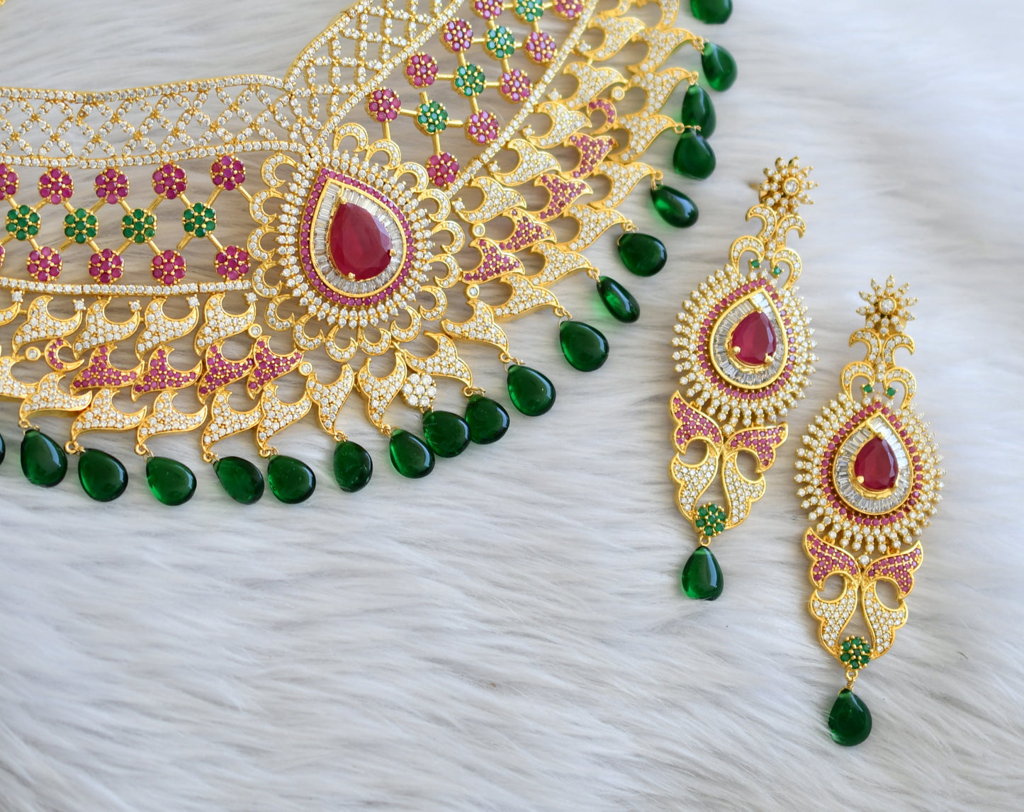 Gold tone cz ruby-emerald-white green beaded bridal choker necklace set dj-45278