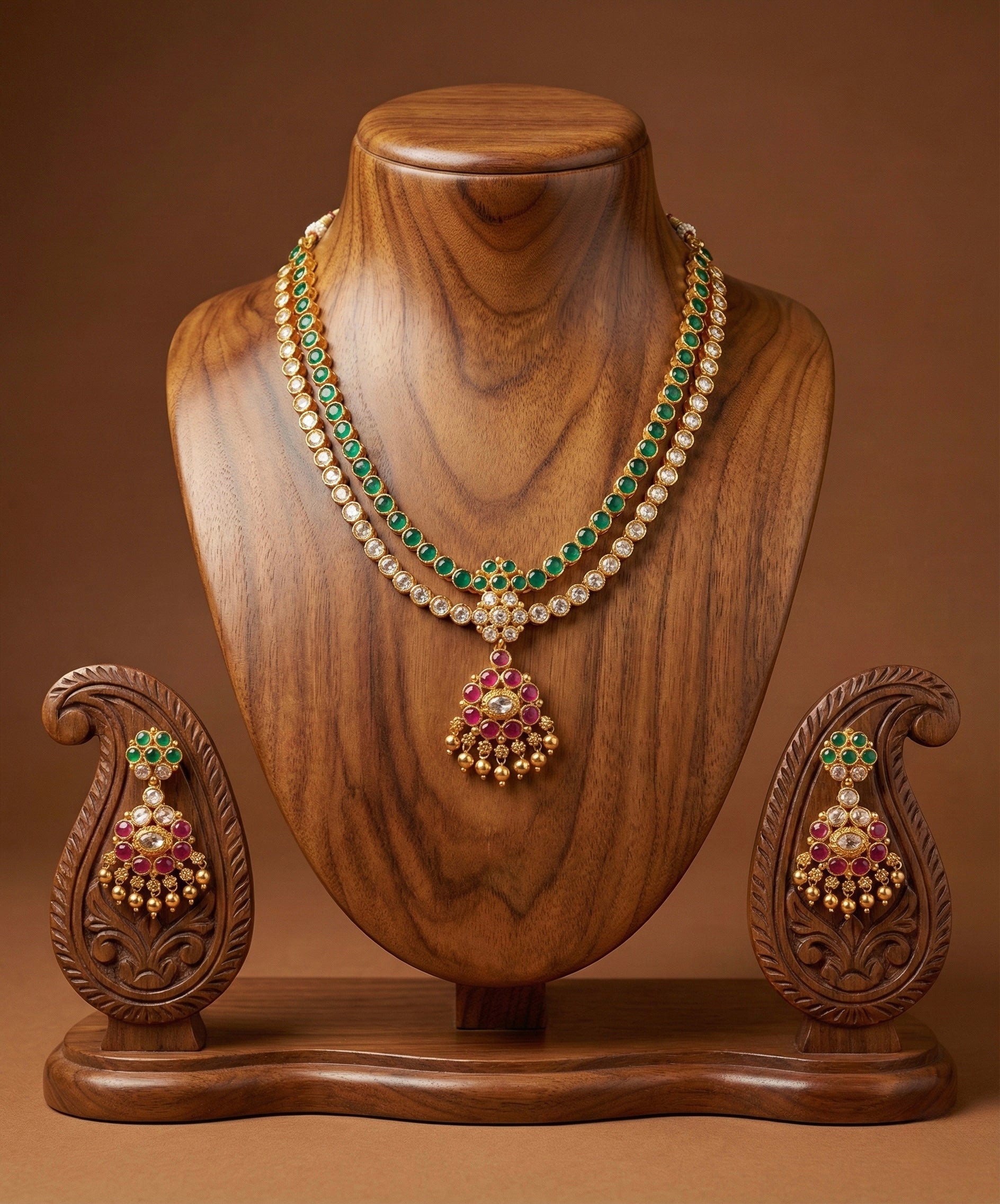 Matte finish green-white-pink double layer attigai/necklace set dj-52720