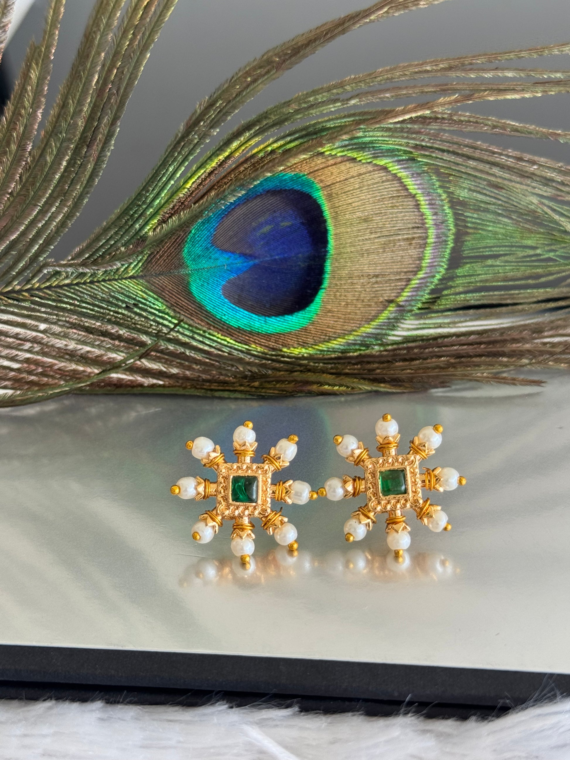 Gold tone green-pearl square stone beaded stud/earrings dj-51595