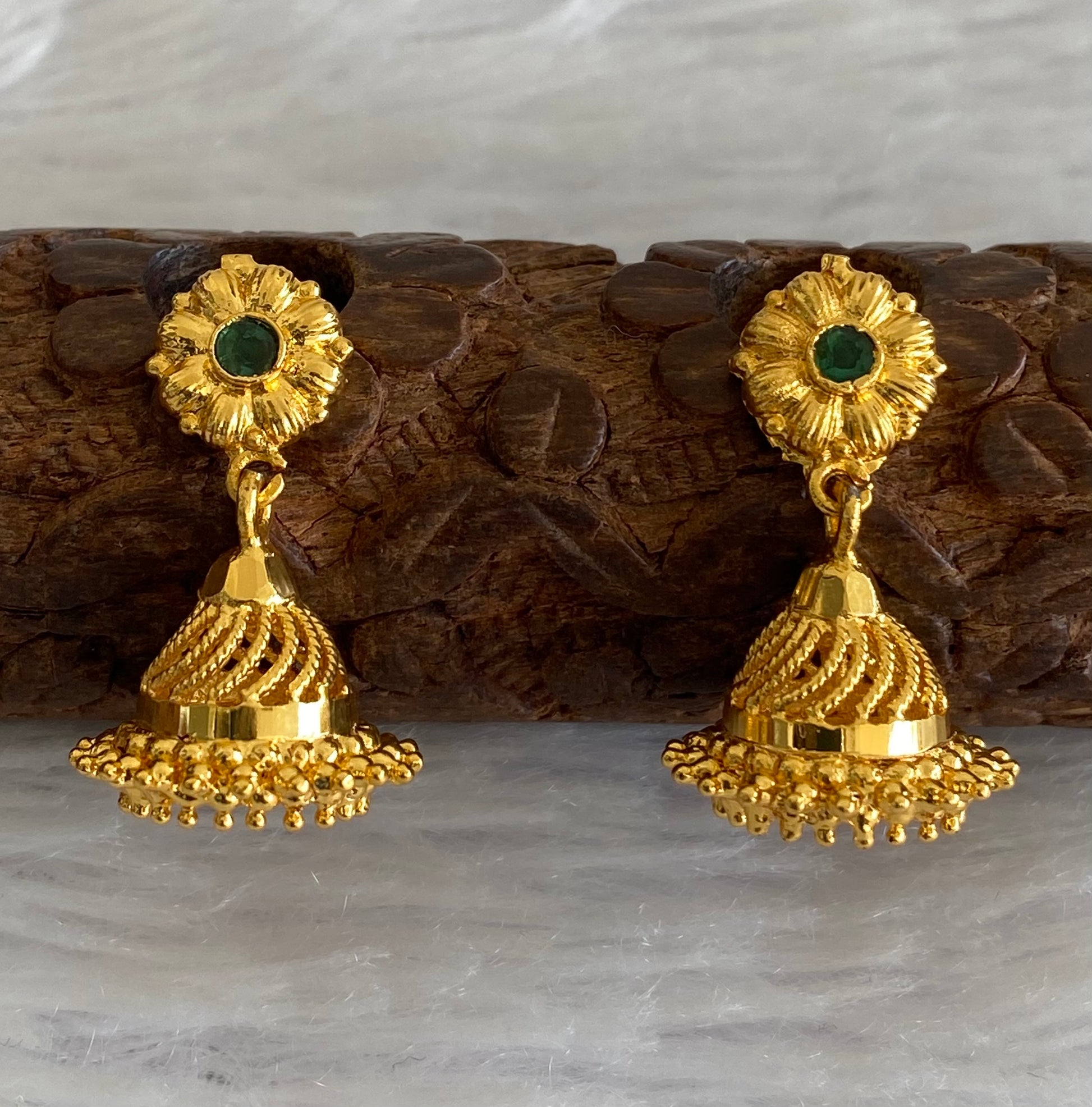 Gold tone green stone flower screw back jhumkka-dj52893