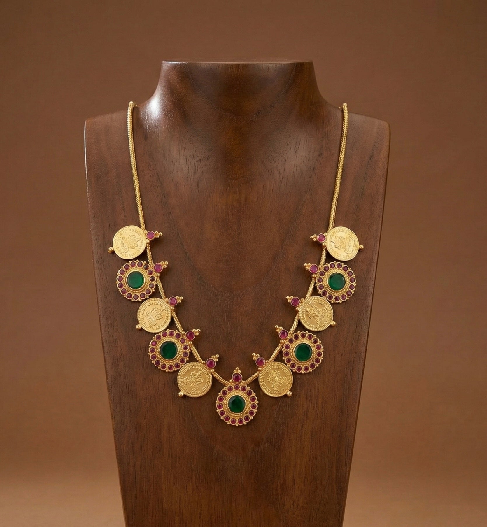 Gold tone kerala style pink-green round lakshmi coin necklace dj-51691