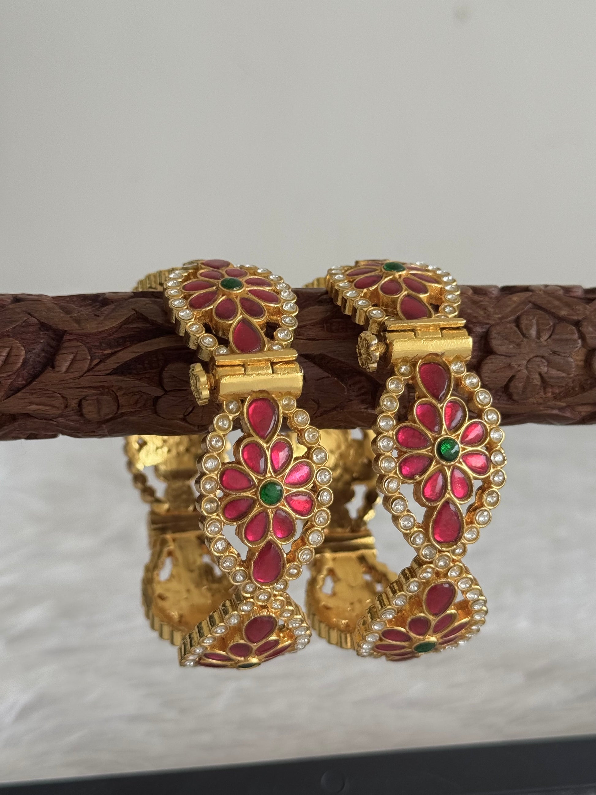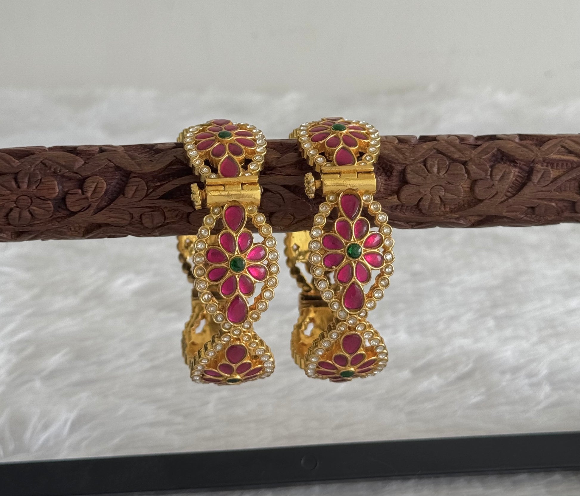 Gold tone pink-green flower kundan jadau screw type bangles(2.4) dj-51566