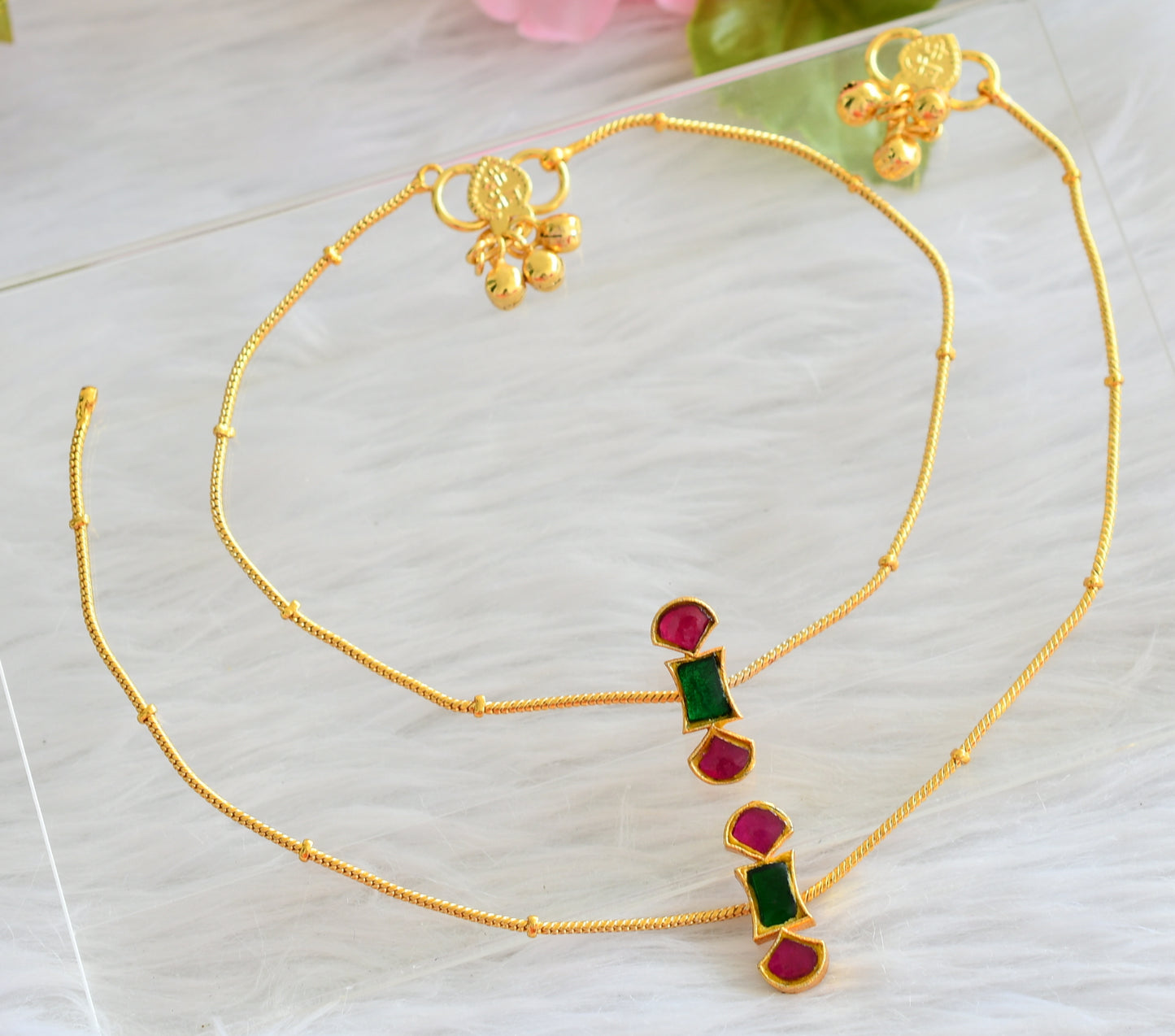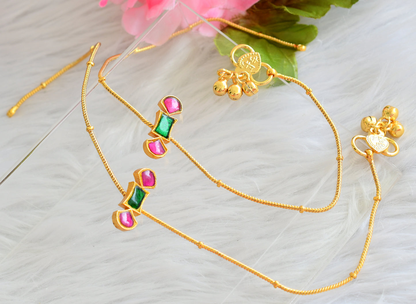 Gold tone pink-green kundan jadau anklets dj-44099