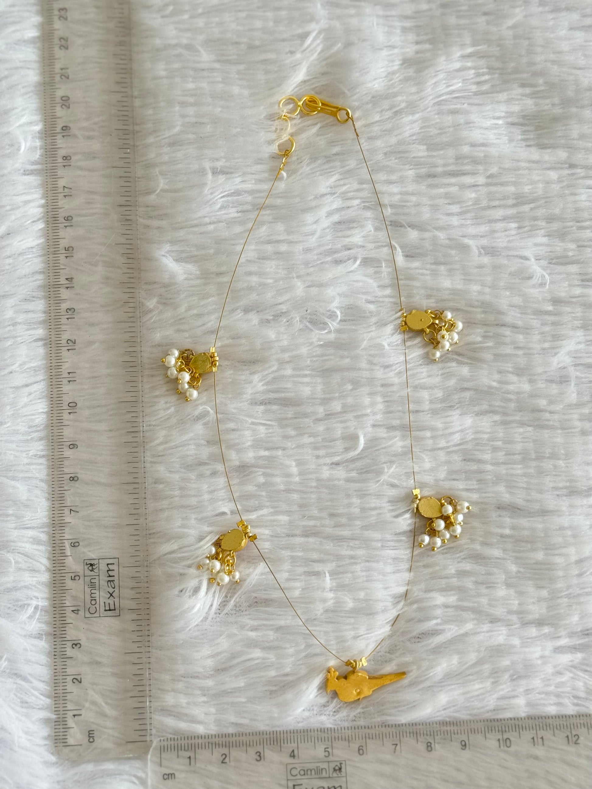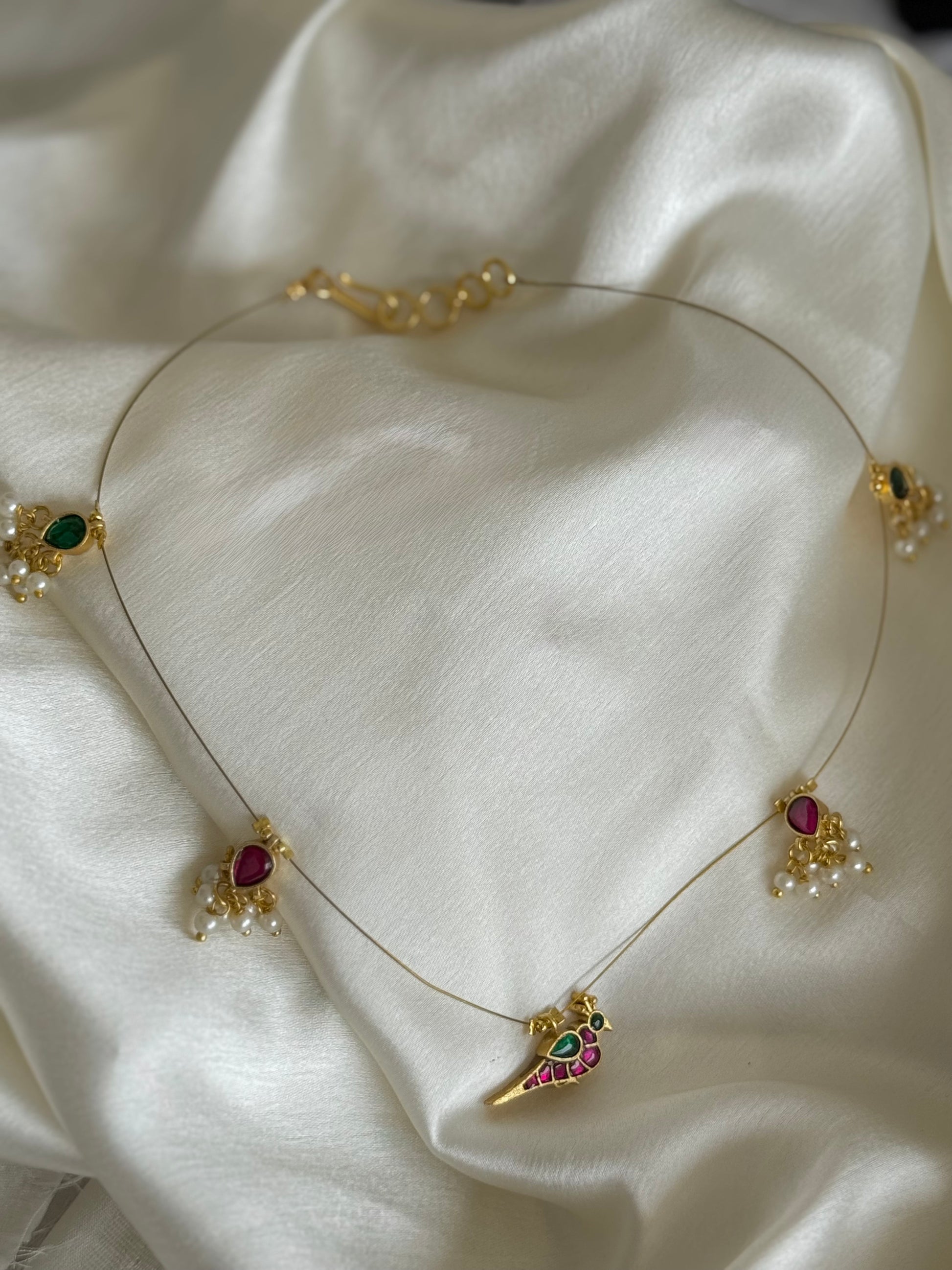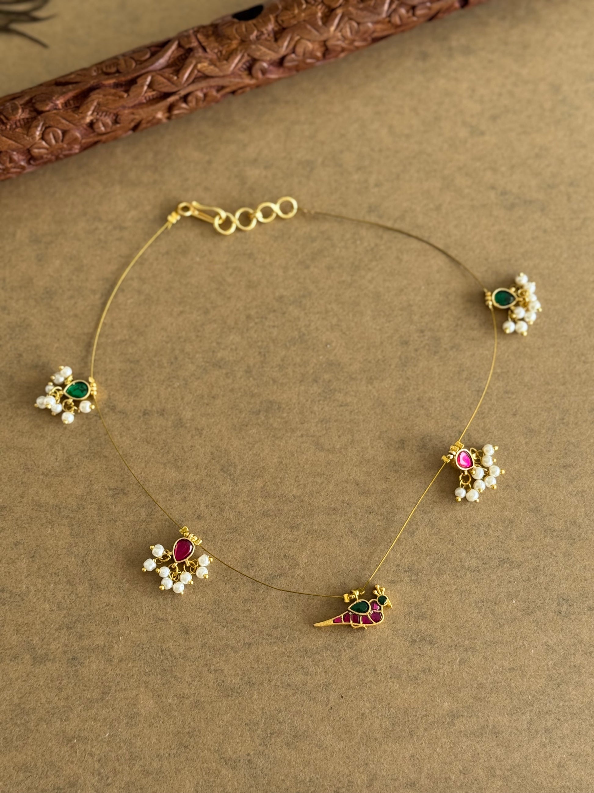 Gold tone pink-green kundan jadau bird invisible necklace dj-51547