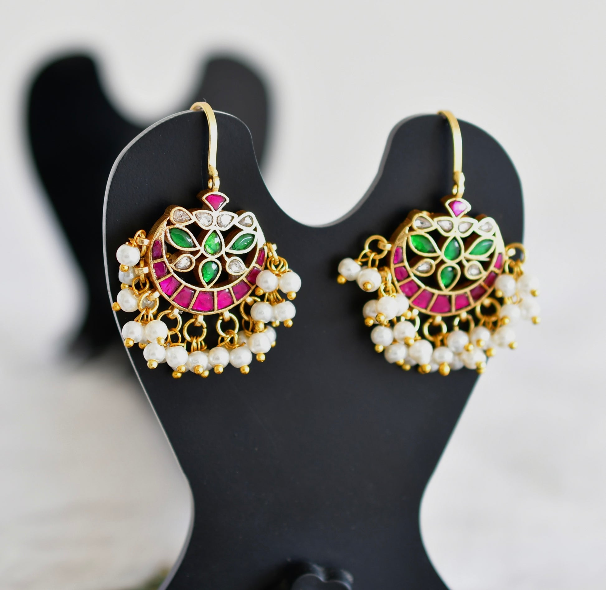 Gold tone pink-green-white kundan jadau bali bugadi earrings dj-52474