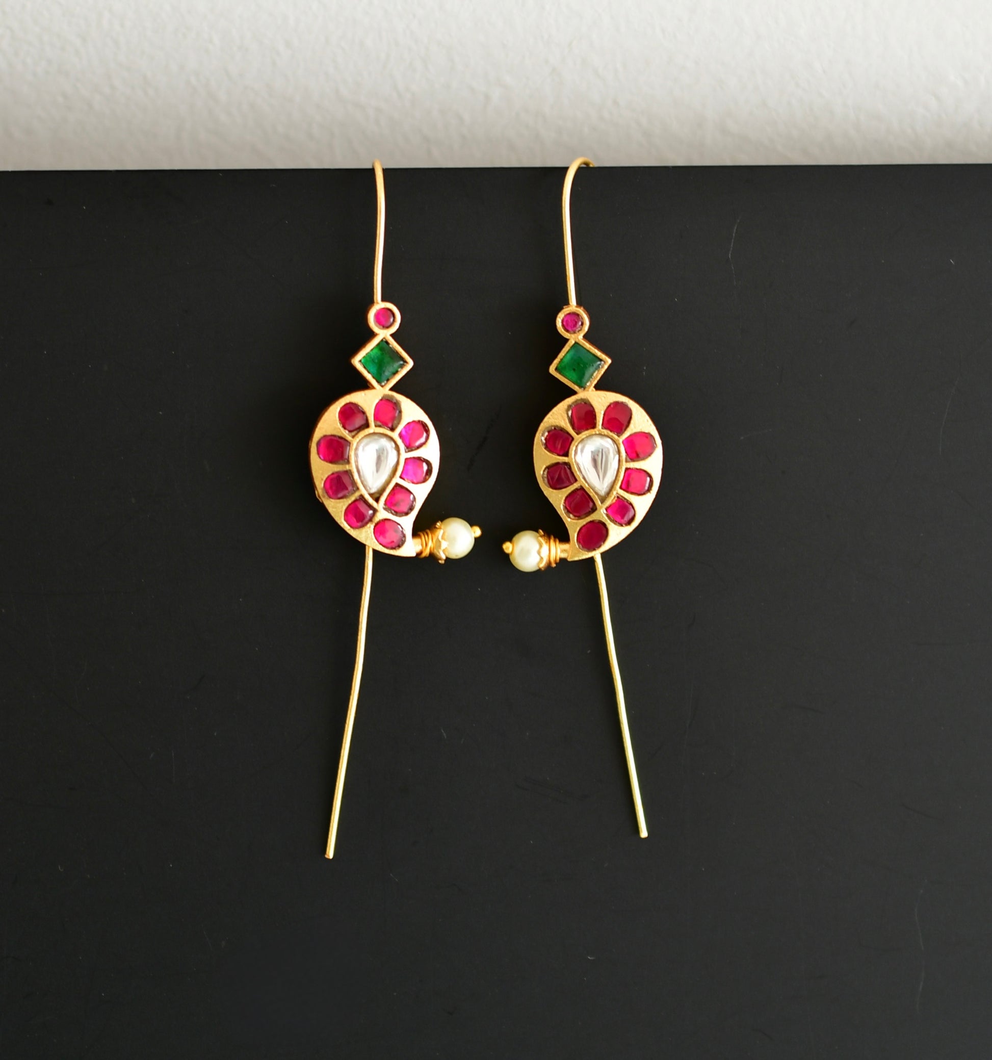 Gold tone pink-green-white kundan jadau mango bugadi needle earrings dj-52462