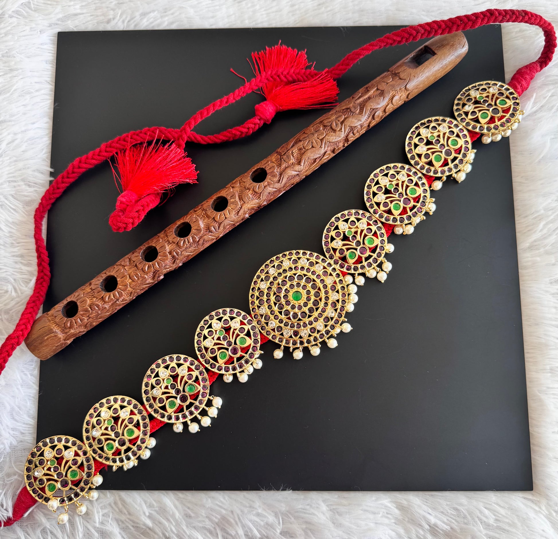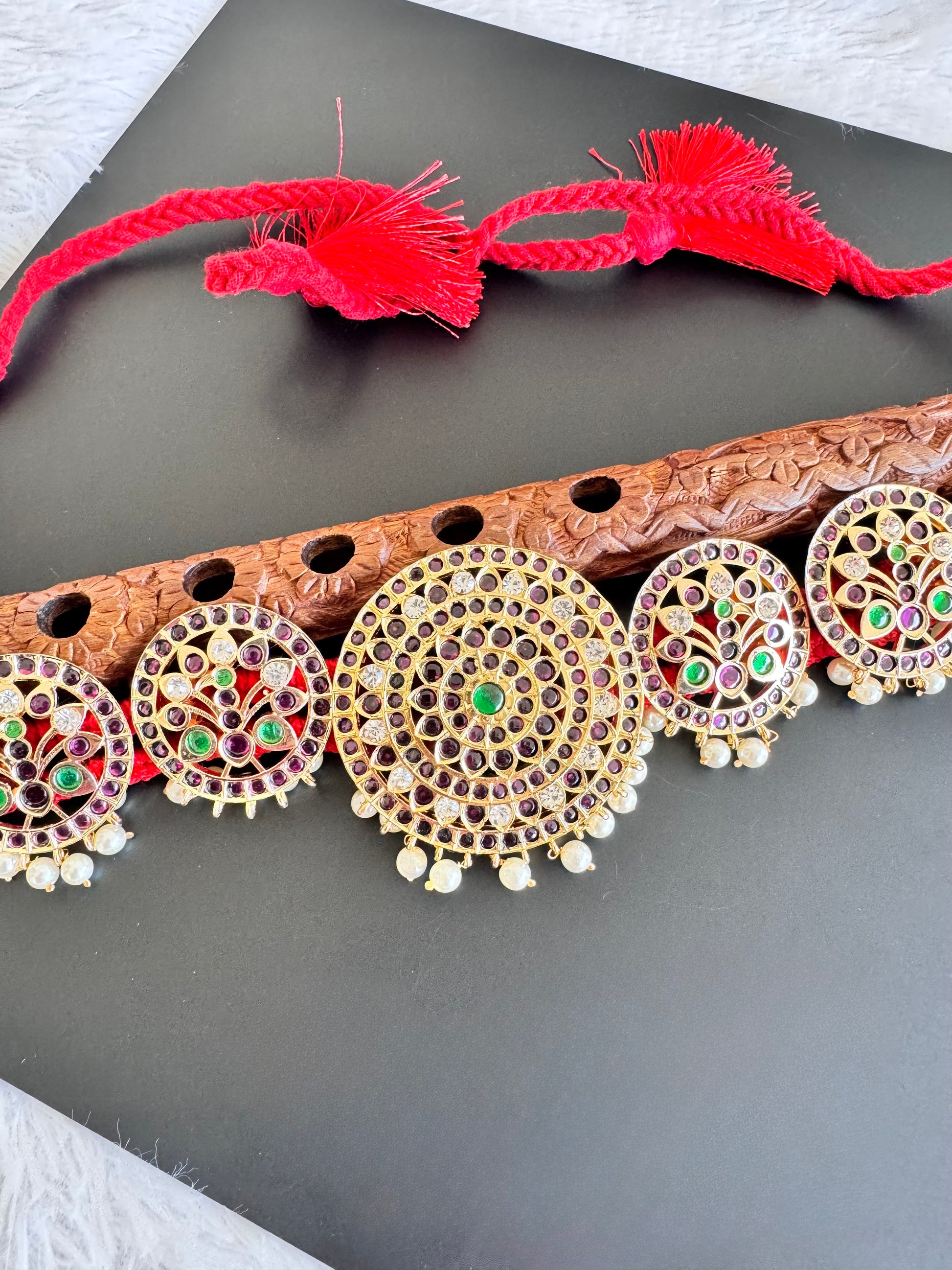 Gold tone precious kemp-green pearl round peacock waist band dj-52541