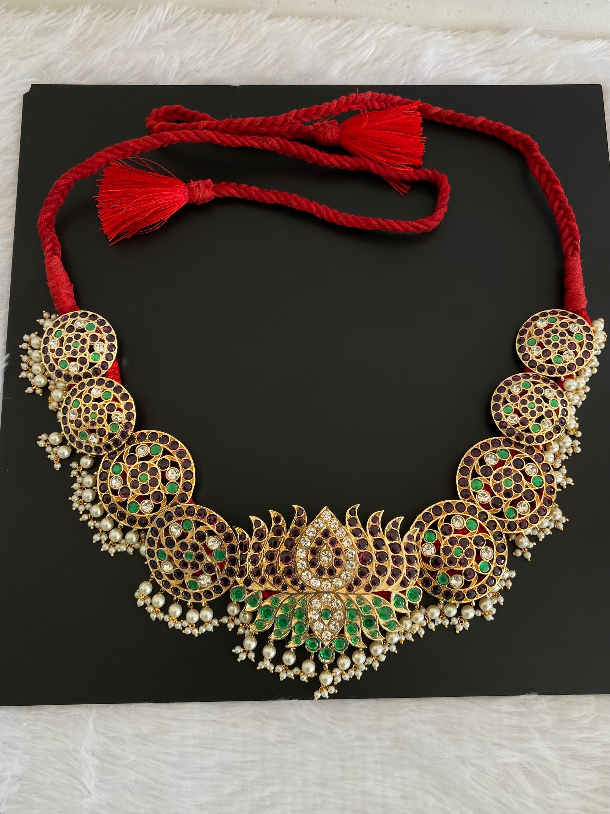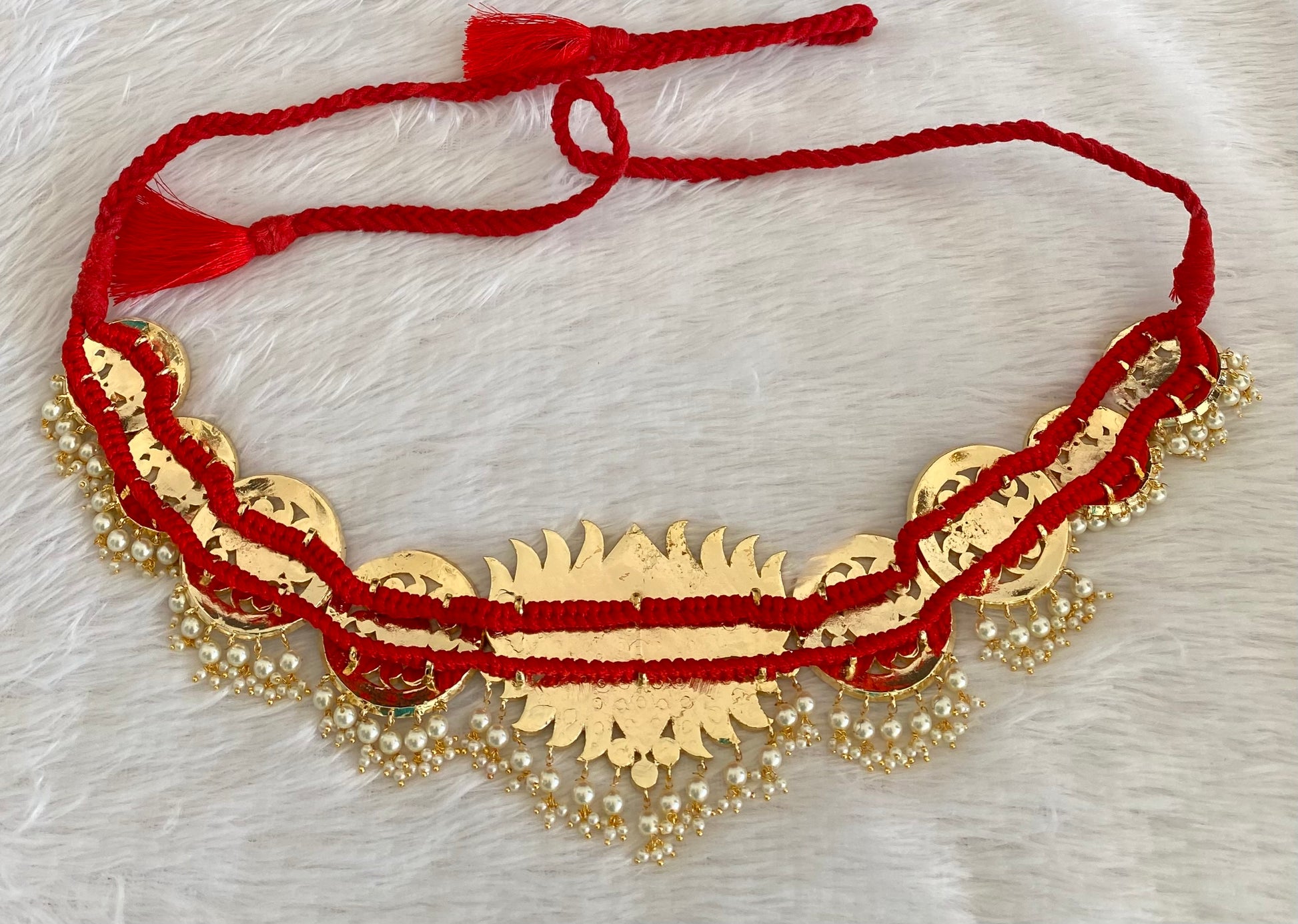 Gold tone precious kemp-green-white pearl round peacock lotus waist band dj-53376