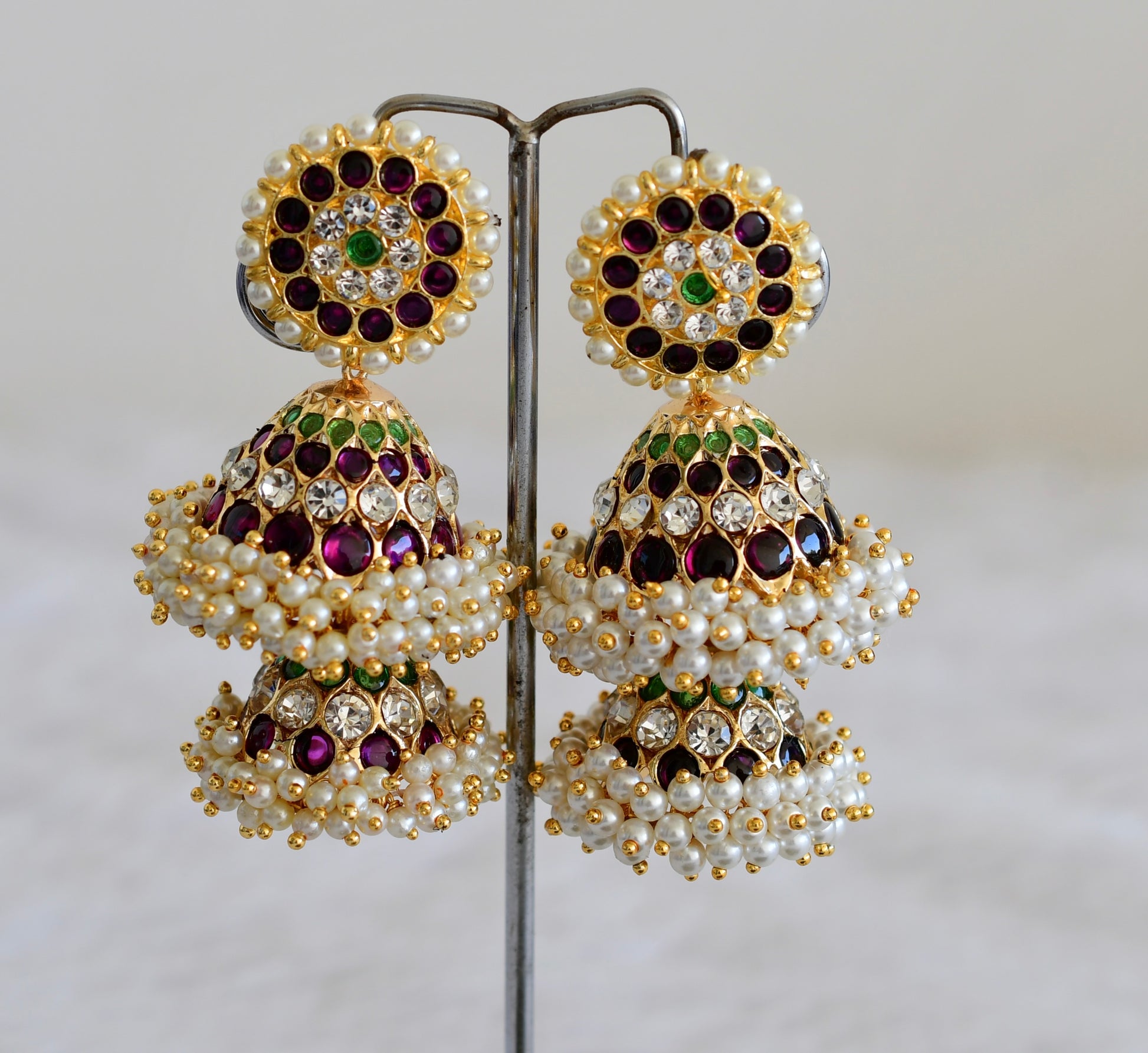Gold tone precious kemp-green-white stone pearl big step jhumkka dj-52519